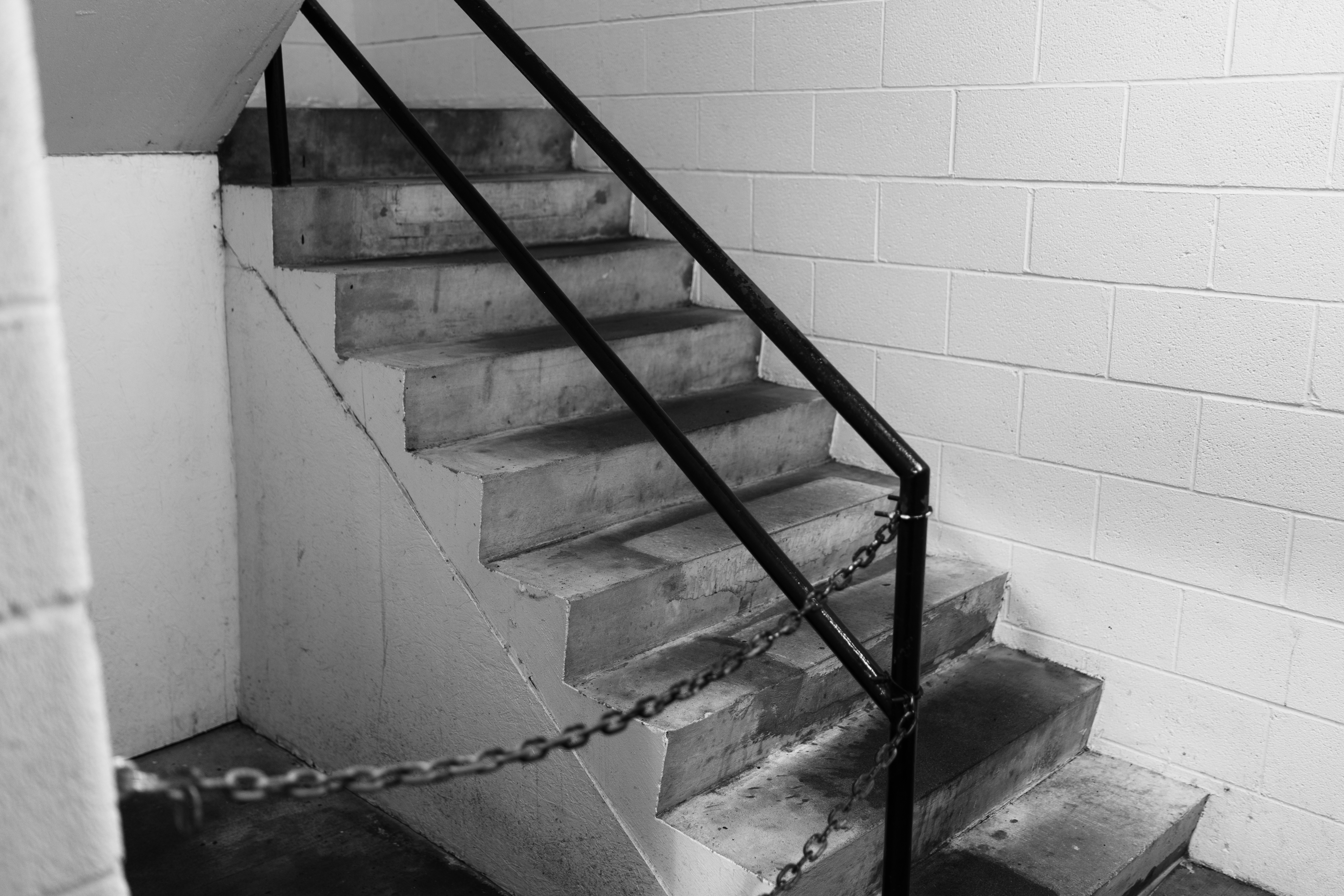 The image captures a stark staircase leading downwards, framed by stark white walls and cast in a somber black and white tone. The interplay of light and shadows creates an atmosphere of isolation, inviting curiosity about what lies below. The imposing metal rail and chain suggest a sense of confinement, enhancing the mood of suspense and intrigue.