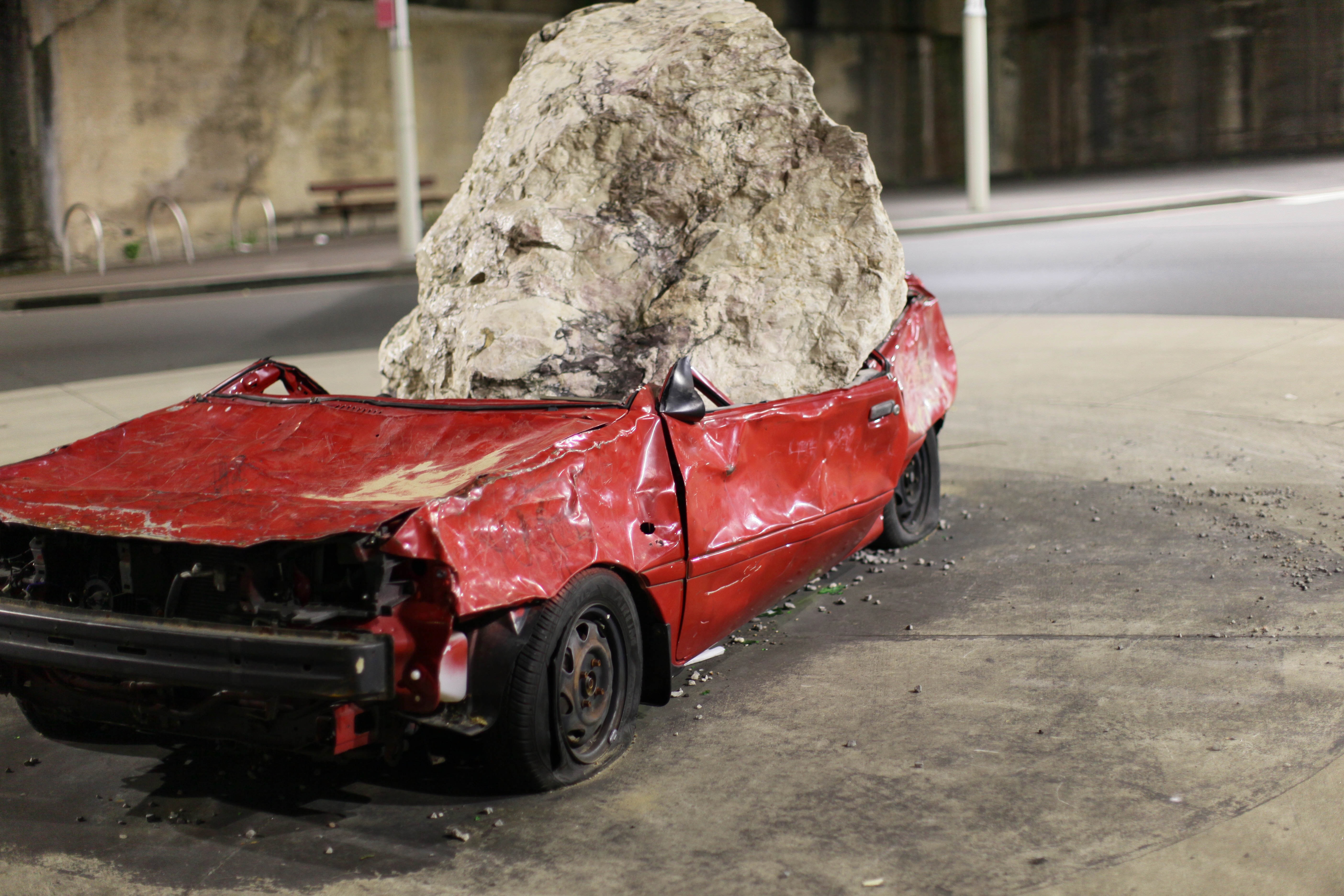 The photograph captures a battered red car almost entirely overshadowed by an immense rock perched precariously on its roof. The scene is bathed in soft, ambient light, enhancing the surreal juxtaposition between the vehicle and the imposing stone. This unexpected collision of manmade and natural elements evokes a sense of desolation and absurdity, inviting contemplation on themes of burden and resilience.