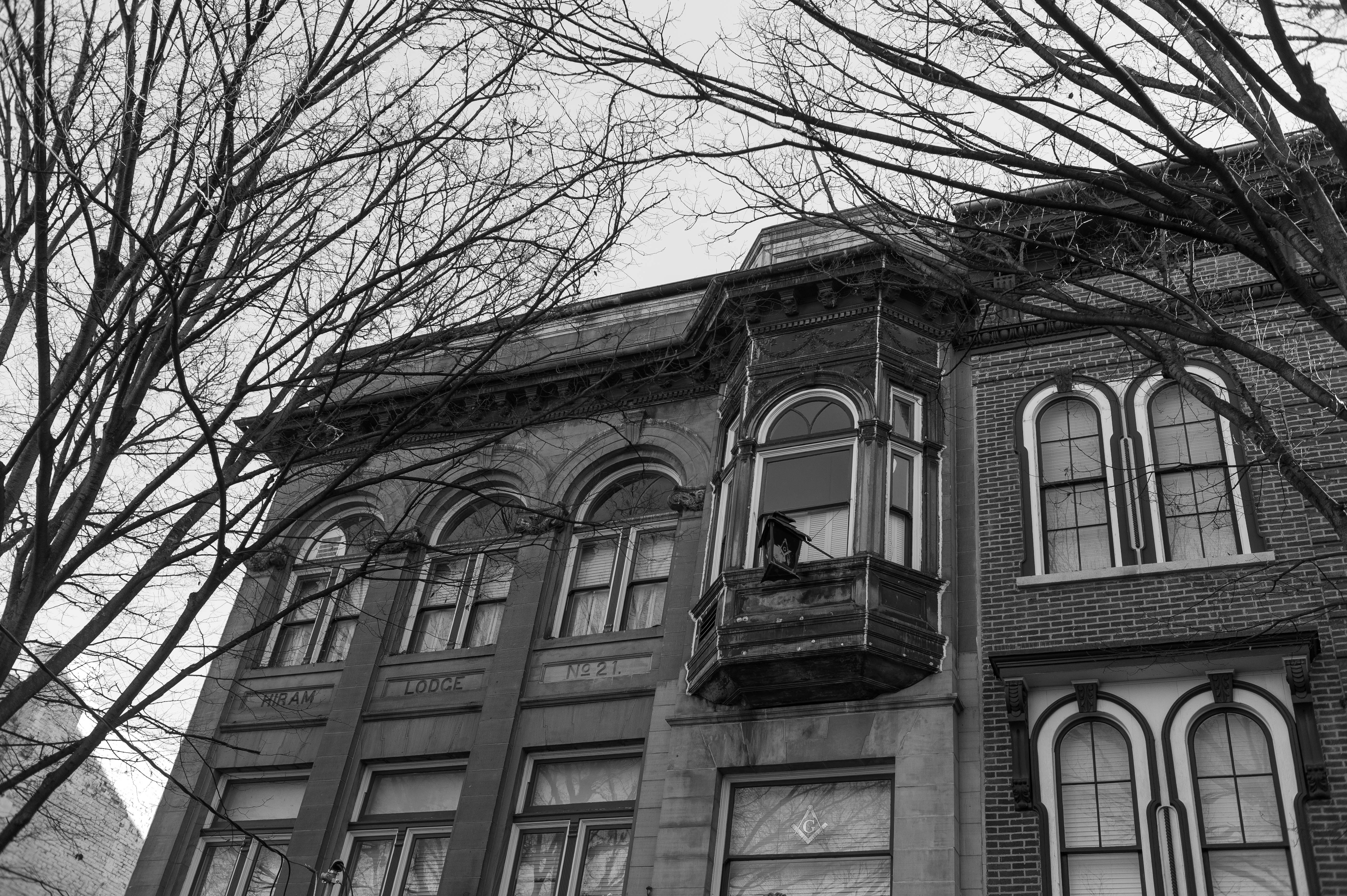 This photograph captures an old building with intricate architectural details, half-obscured by the skeletal branches of bare trees. The monochrome palette evokes a sense of nostalgia, while the weary yet alluring facade suggests stories of a bygone era. The composition draws the eye upward, inviting reflection on both the structure and its surroundings, set against a muted sky.