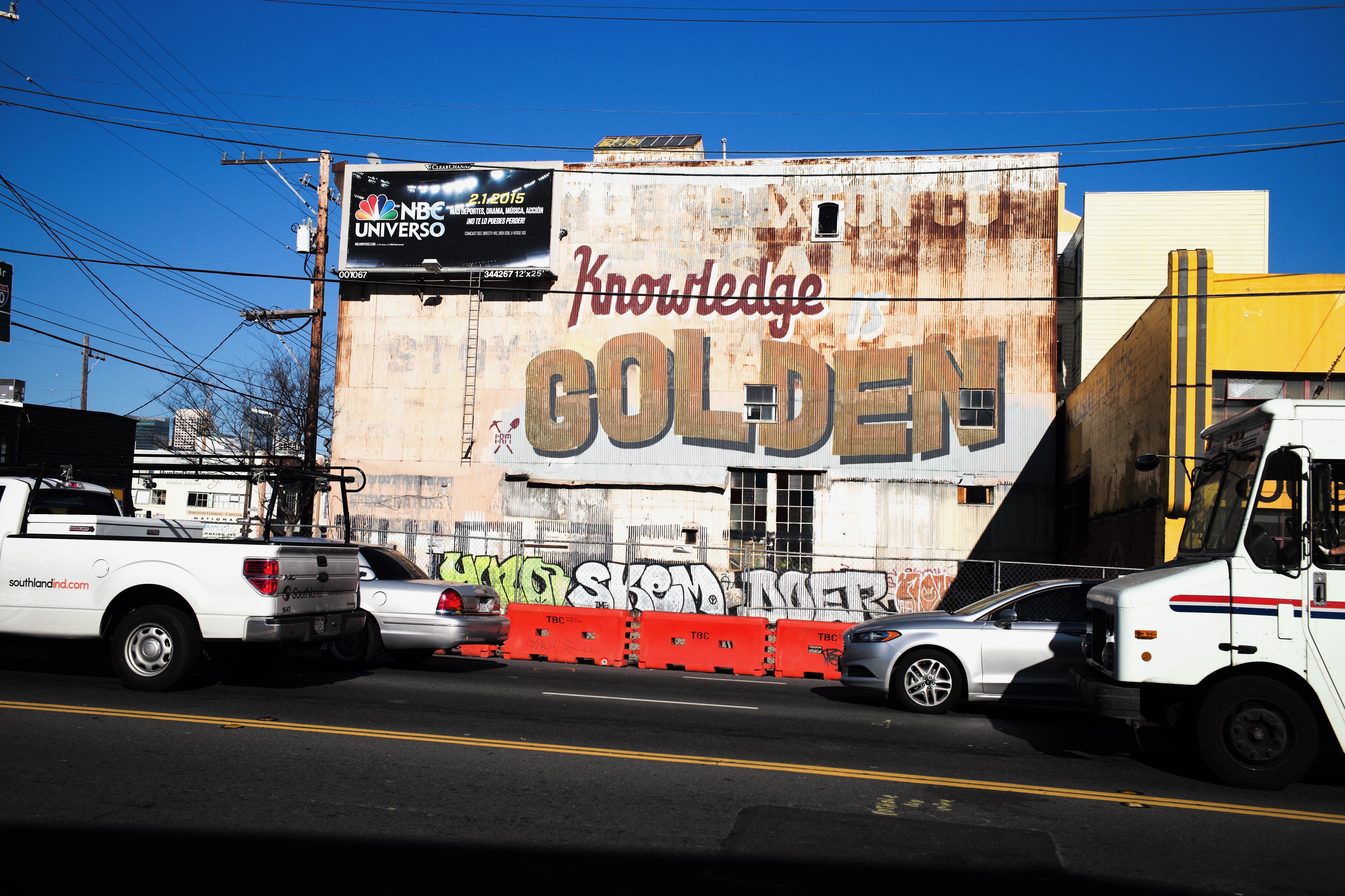 The photograph captures a weathered building facade dominated by the faded, oversized words 'Knowledge Golden,' layered with colorful graffiti. The clear blue sky contrasts sharply with the peeling paint and urban clutter, creating a vibrant yet melancholic mood. Vehicles in the foreground and utility lines crisscrossing the image add depth to the composition, emphasizing the bustling urban environment.