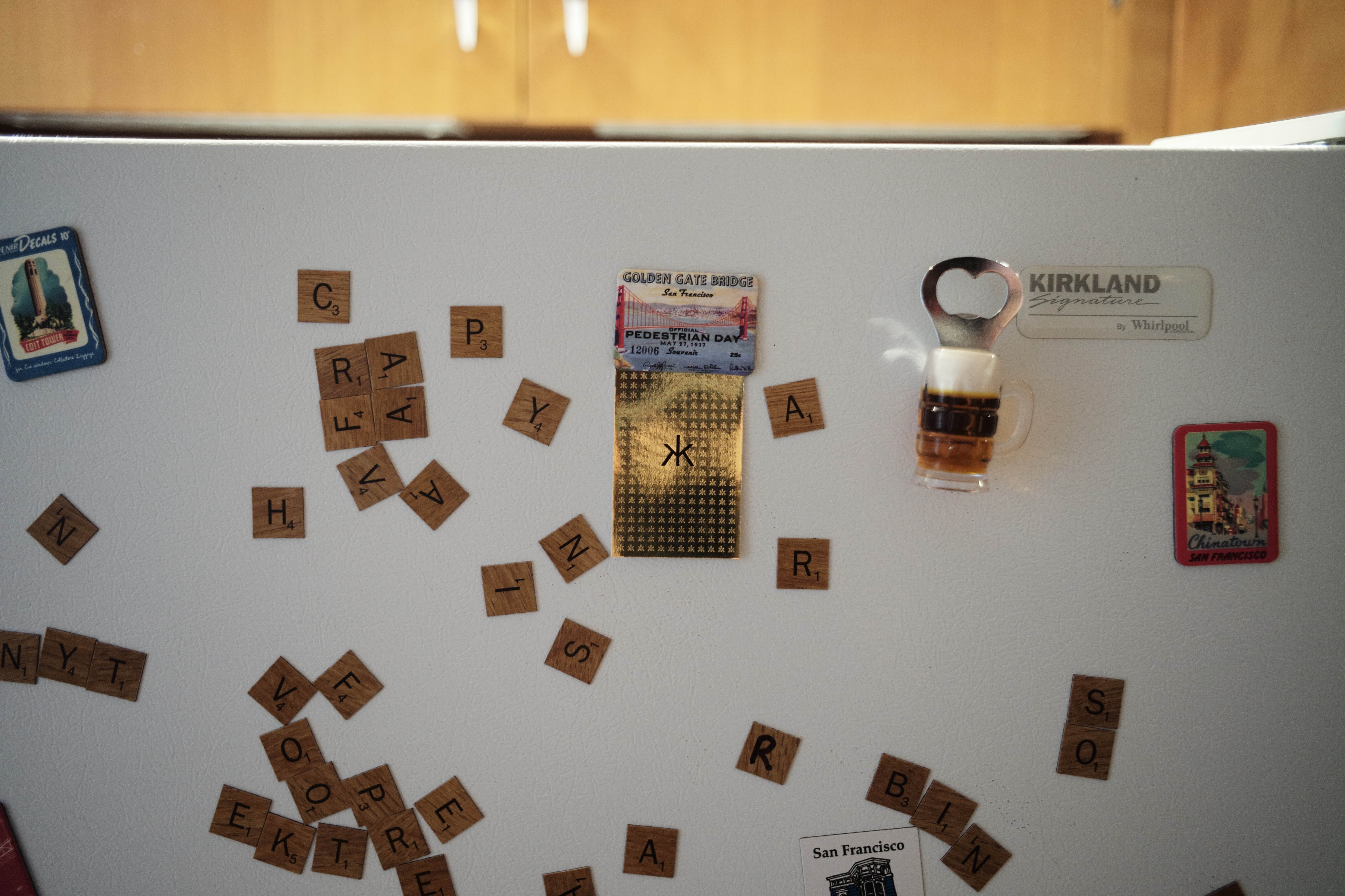 The photograph captures a white refrigerator adorned with a scattered assortment of magnetic letters, postcards, and a bottle opener, creating a playful and nostalgic atmosphere. Warm lighting softly illuminates the scene, enhancing the intimate feel of a lived-in kitchen space, while the random letters and trinkets invite curiosity and creativity. The composition balances both chaos and charm, reflecting personal stories and casual moments of daily life.