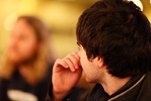 The photograph captures a young man in profile, his gaze turned inward as he thoughtfully rests his hand against his mouth. Soft, warm lighting lends a cozy ambiance to the scene, while the blurred figure in the background suggests a casual social setting, enhancing the mood of introspection. This composition draws the viewer into an intimate moment of reflection amid a vibrant environment.