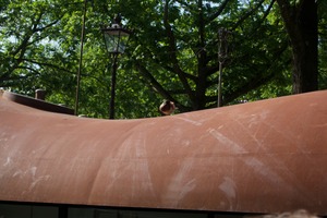 This photograph captures a whimsical moment where a figure peers over a rounded, rust-colored rooftop, surrounded by vibrant green foliage. Strong natural light filters through the trees, creating a lively and inviting atmosphere. The composition draws the eye upward, inviting curiosity about the perspective and the world beyond.