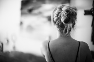 The photograph captures a woman from behind, her hair styled in a loose bun, creating an intimate and contemplative mood. Soft, diffused lighting accentuates the gentle contours of her shoulders while a blurred background suggests a serene, unhurried space. The monochrome palette adds to the emotional depth, evoking a sense of nostalgia and introspection.