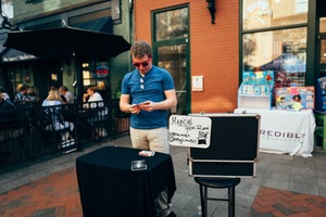 In a lively outdoor setting, a young magician focuses on his deck of cards, embodying concentration and anticipation. The warm lighting casts a welcoming glow, enhancing the playful atmosphere among a crowd enjoying the day. Vibrant colors of the magician's attire contrast with the rich brick background and added elements of the bustling street scene.