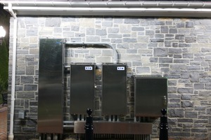 The photograph showcases a series of metallic utility boxes mounted against a rugged stone wall, creating a striking juxtaposition of materials. The soft glow of ambient light adds a serene and somewhat surreal quality, emphasizing the stark modernity of the metal against the timelessness of the stone. This composition invites viewers to appreciate the beauty found in industrial details and urban environments.