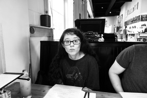 In a cozy eatery, a young woman with glasses captures attention with a playful, surprised expression. The black-and-white tone emphasizes the contrasts in the scene, while soft natural light filters in from the windows, imparting a warm, inviting ambiance. Menu items lie forgotten on the table as her wide-eyed gaze suggests a delightful conversation unfolding around her.