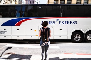 A lone traveler stands before a large bus, embodying a sense of anticipation and solitude. The bright sunlight casts a stark contrast, illuminating the subject against the imposing vehicle, while urban elements subtly frame the scene. The composition draws the eye through the interplay of shadow and light, evoking feelings of journey and exploration.