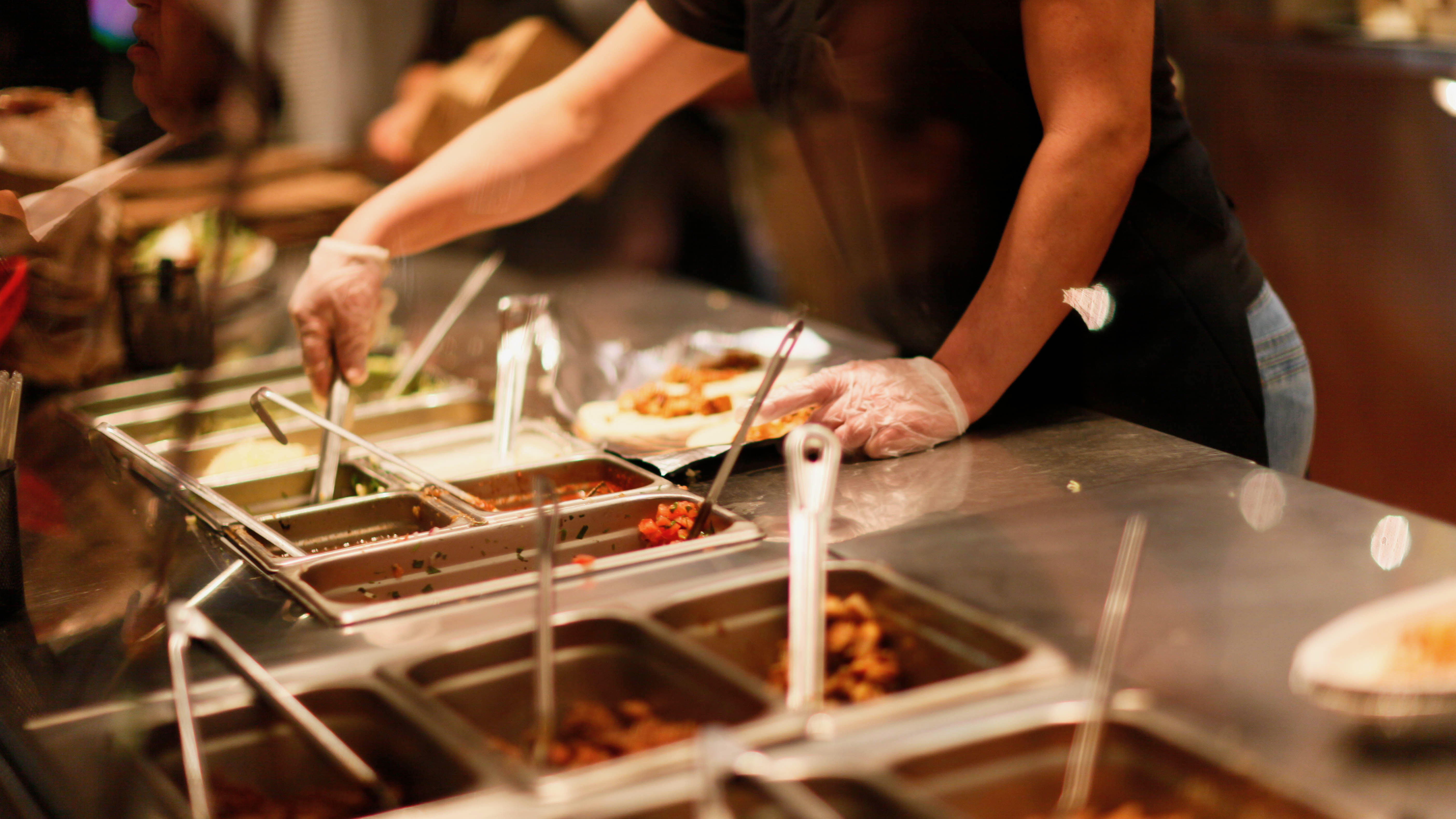 The photograph captures a vibrant scene of a food preparation area, with a focused hand skillfully serving colorful ingredients from stainless steel pans. The warm, diffused lighting creates an inviting atmosphere, suggesting the hustle and bustle of a lively kitchen. This intimate moment highlights the artistry of food assembly, evoking flavors and anticipation of a delicious meal ahead.