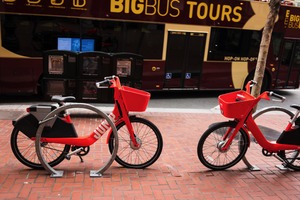 The photograph captures a pair of vibrant red rental bicycles parked against a textured brick sidewalk, with a bus advertising 'BIG BUS TOURS' in the background. The composition contrasts the sleek lines of the bikes with the robust shape of the double-decker bus, evoking a sense of urban adventure. Soft, natural lighting casts gentle shadows, enhancing the inviting yet energetic mood of the scene.