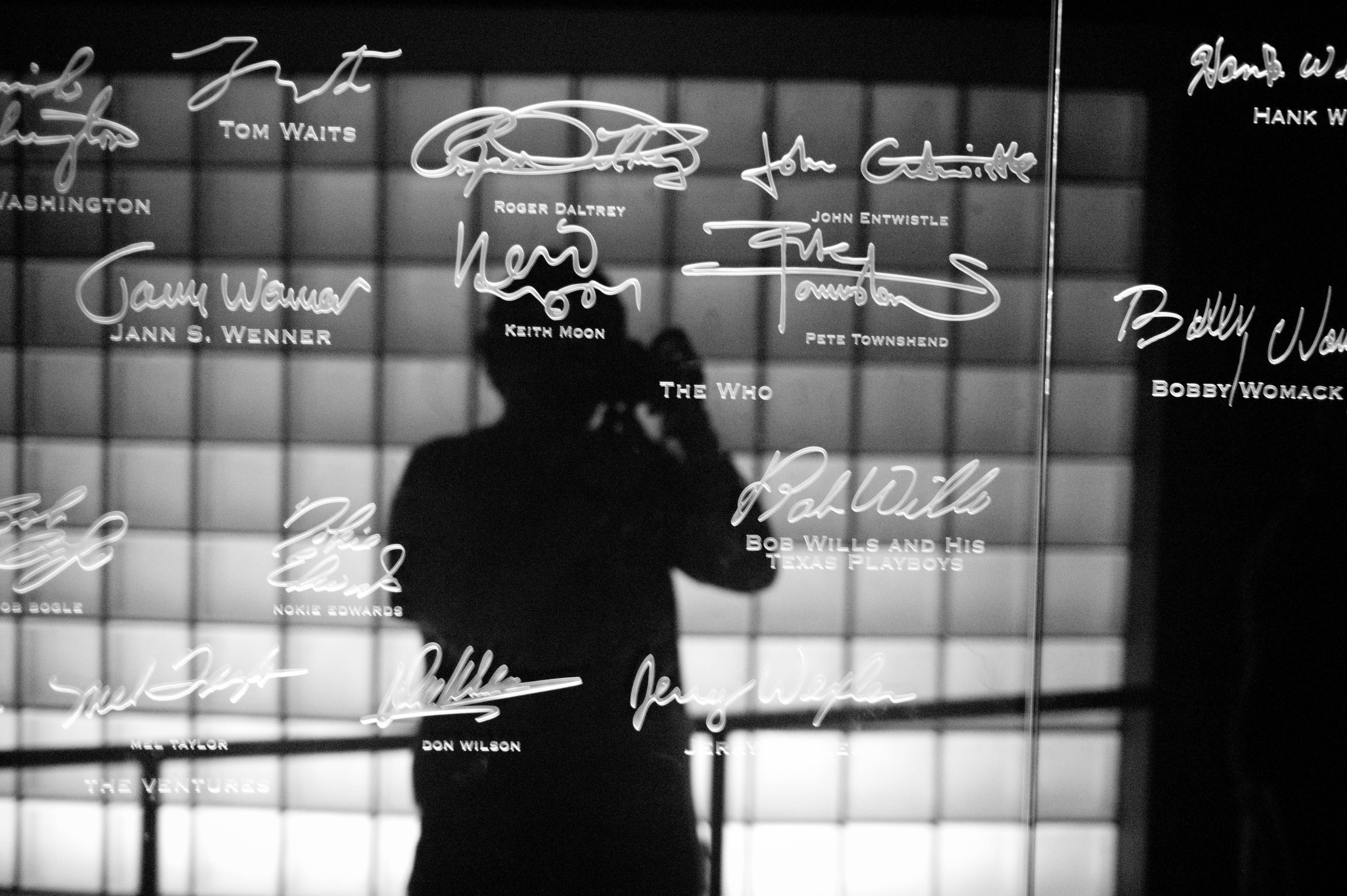 This black-and-white photograph captures a wall adorned with signatures of iconic musicians, evoking a sense of timeless nostalgia. The interplay of light creates a dramatic contrast, highlighting both the glossy surface of the signatures and the soft grid behind them. A reflected silhouette adds an intriguing layer, symbolizing the ongoing connection between fans and the legendary figures immortalized here.