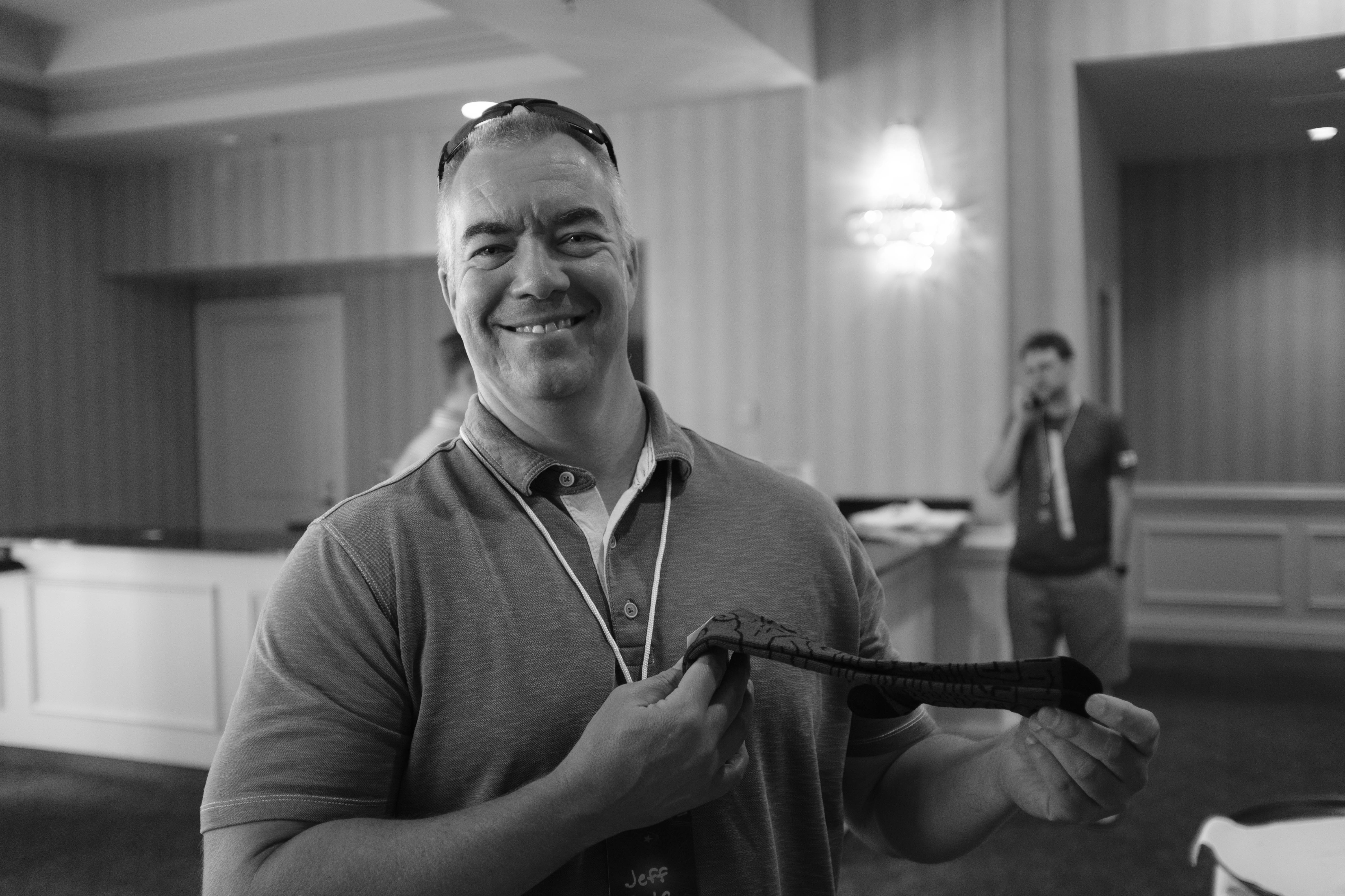 A cheerful man stands prominently in the foreground, holding a peculiar object that seems to evoke curiosity. Soft lighting bathes the room, creating a warm atmosphere, while the blurred figures in the background suggest an engaging event. The black and white composition emphasizes the man's joyful expression and adds a timeless quality to the moment.