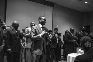 This photograph captures a lively gathering where a charismatic speaker addresses an attentive audience. The rich tones of the black-and-white format enhance the mood of connection and camaraderie among the well-dressed attendees, with the focused lighting on the speaker illuminating his animated gestures. The composition reflects a blend of excitement and formality, highlighting the communal spirit of the event.