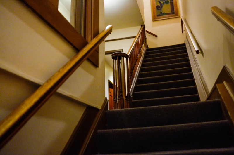 The photograph captures a staircase leading upward, framed by warm wooden railings and softly lit walls that evoke a sense of nostalgia. The composition draws the eye along the ascending steps, while the subdued lighting creates an intimate, almost mysterious atmosphere. A glimpse of the upper floor hints at stories waiting to be discovered, adding depth to the scene.