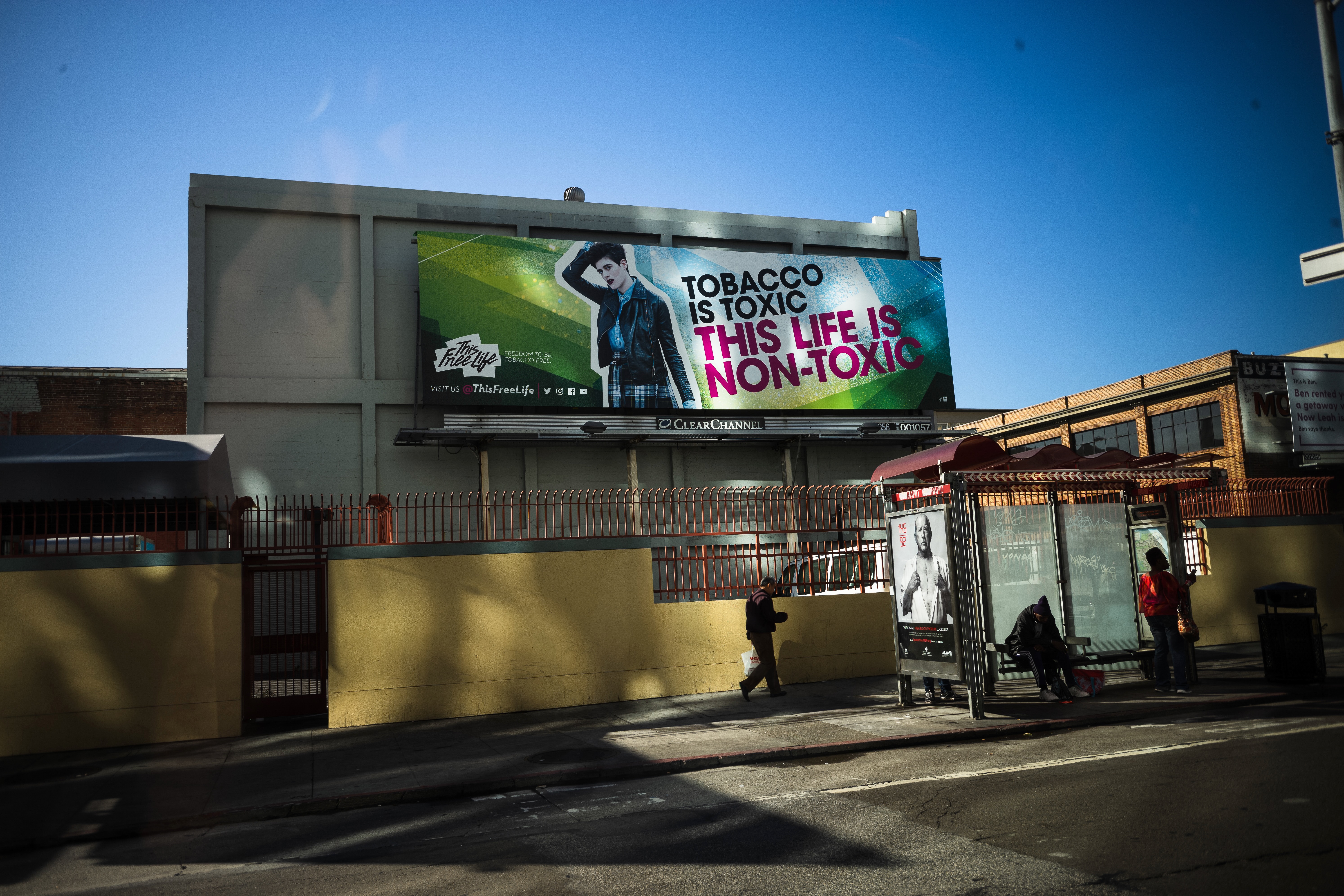 This photograph captures a striking billboard conveying a powerful anti-tobacco message against a clear blue sky. The dynamic colors of the advertisement contrast with the muted tones of the urban landscape, emphasizing the urgency of the statement. The lighting adds a crisp clarity, drawing attention to both the billboard and the solitary figures waiting at the bus stop below, creating a juxtaposition of awareness and everyday life.