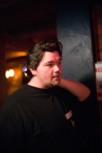 The photograph captures a man in a dimly lit environment, exuding a relaxed yet introspective mood. Soft lighting casts a warm glow on his face, highlighting his features while creating a sense of intimacy in the scene. The blurred background suggests a lively atmosphere, adding depth to the composition and hinting at the bustling life beyond the frame.