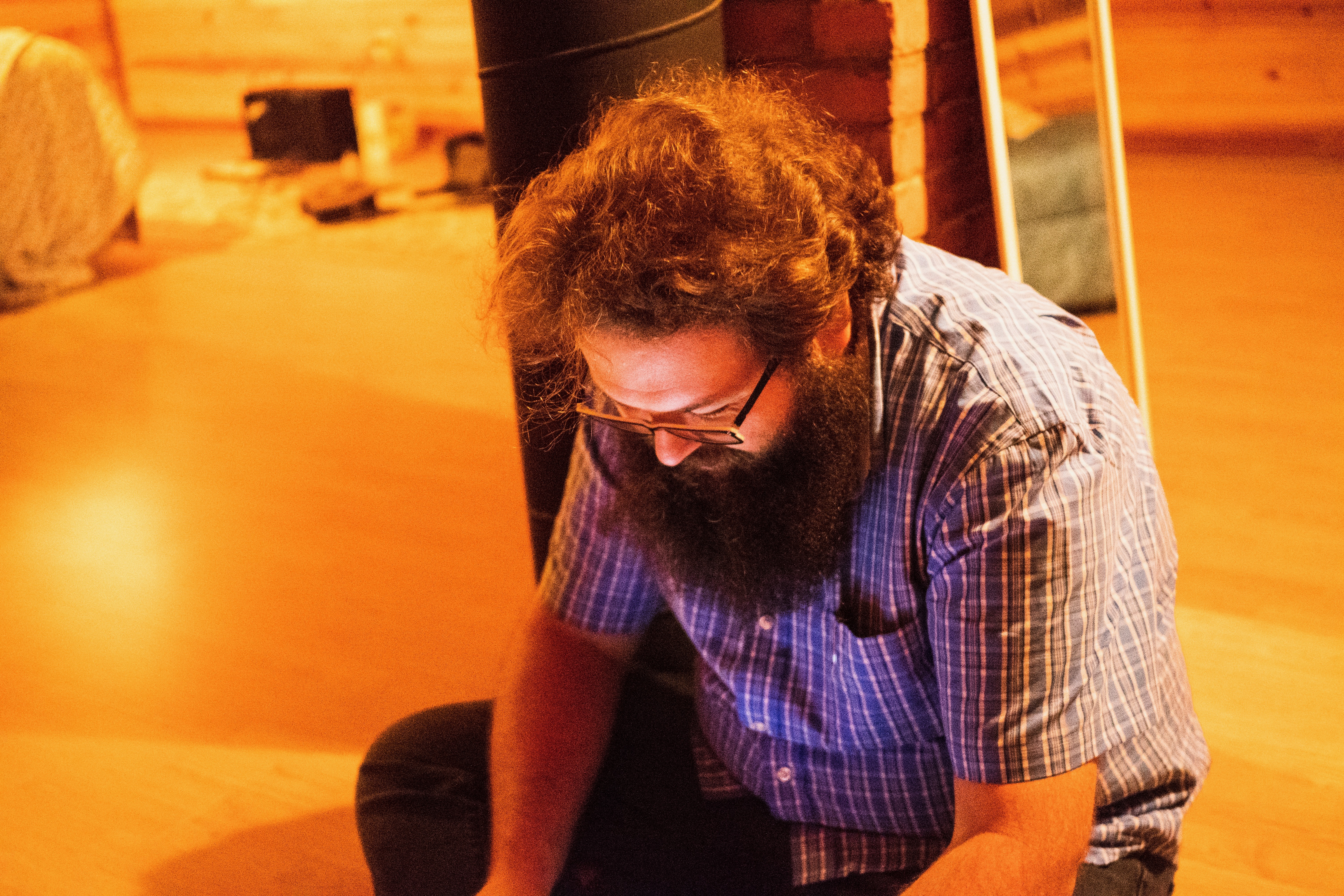The photograph captures a man in a blue plaid shirt, sitting on the floor in a warm, softly lit interior. His focused demeanor, accentuated by his long beard and reading glasses, creates an intimate atmosphere of contemplation amid the rustic charm of the wooden space.