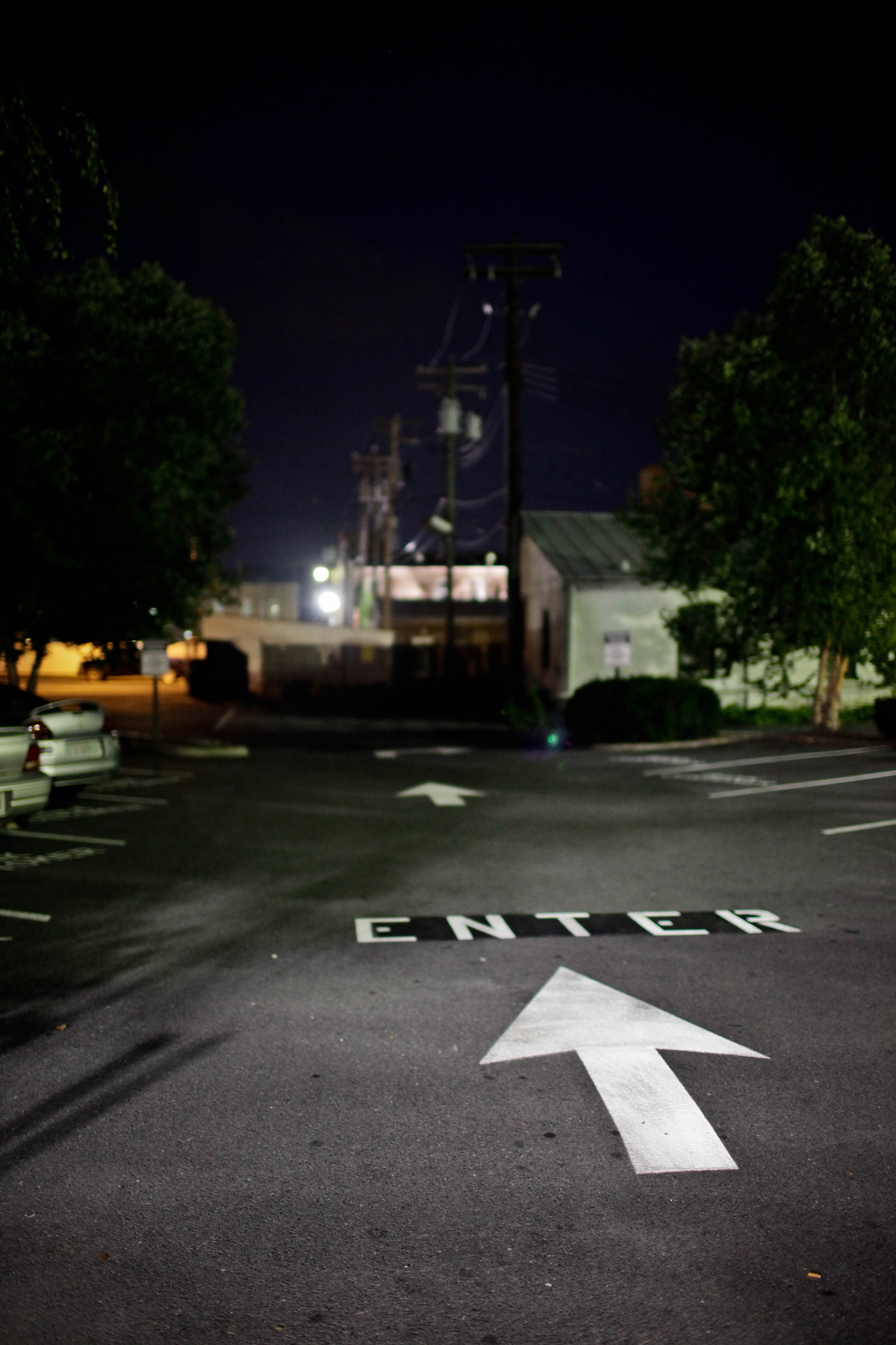 This photograph captures a dimly lit parking lot at night, with the painted word 'ENTER' guiding the viewer's gaze toward the unknown. The soft glow of distant lights contrasts sharply with the darkness, creating an atmosphere that feels both inviting and mysterious. Shadows stretch along the asphalt, while trees frame the scene, adding a touch of nature to the urban setting.