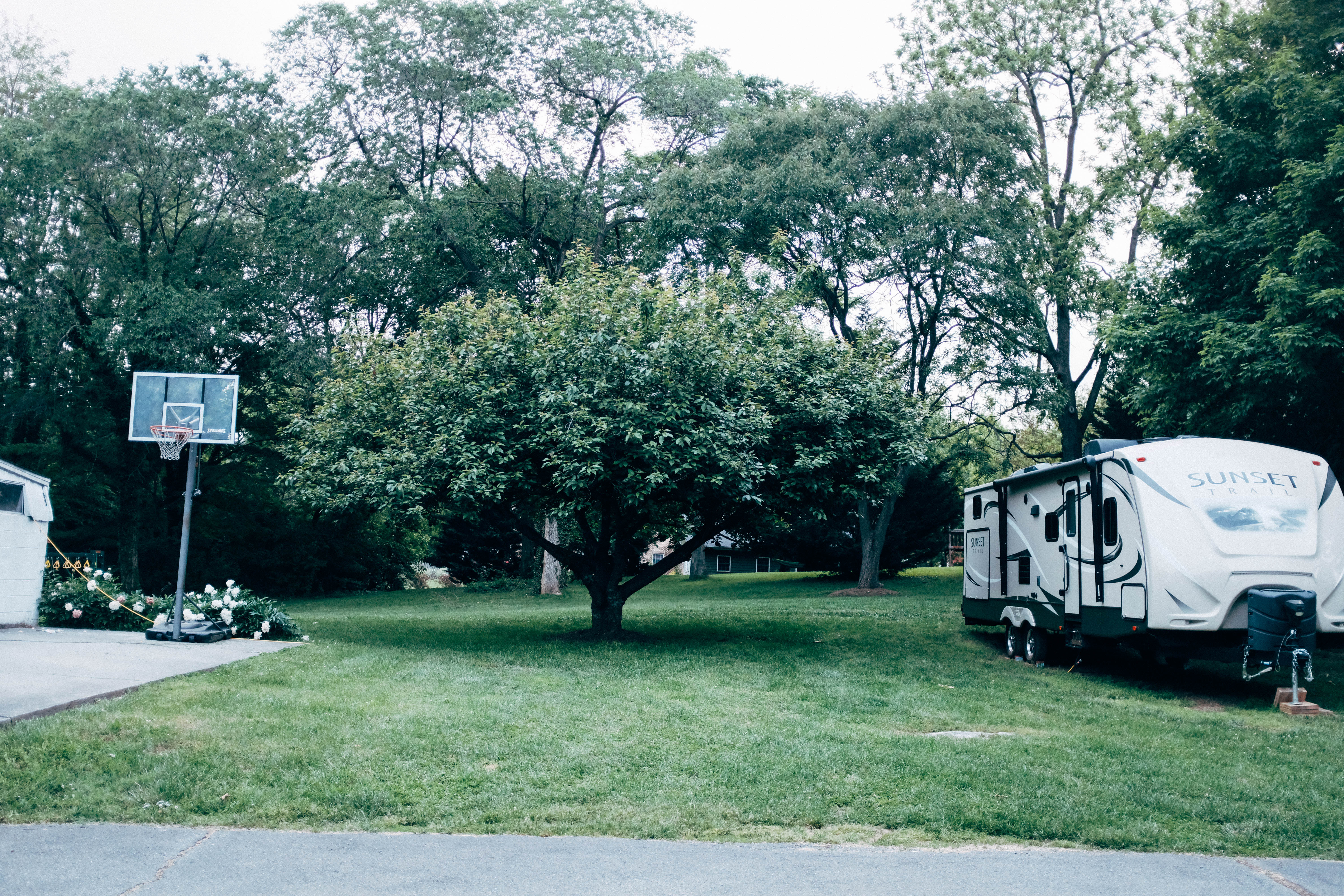 This photograph captures a serene backyard scene featuring a large tree and a parked camper, evoking a sense of tranquility. The muted colors and soft, diffused lighting create a calm atmosphere, while the basketball hoop adds a hint of playful nostalgia. The composition balances nature and leisure, inviting viewers to imagine leisurely afternoons spent outdoors.