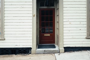 The photograph captures a modest, red door framed by weathered, pale wooden walls, suggesting a sense of history and quiet resilience. Subdued lighting enhances the door's inviting yet enigmatic character, drawing the viewer's attention toward the tactile textures and subtle details of the surroundings. The overall mood evokes curiosity, as if the door invites exploration while guarding its secrets.