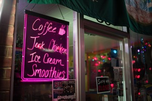 A vibrant neon sign glows in the night, showcasing enticing offerings like coffee, jerk chicken, and ice cream. The soft, warm hues create a welcoming yet melancholic atmosphere, as the 'CLOSED' sign hints at missed opportunities. The blurred background features twinkling lights, enhancing the dreamlike quality of this inviting scene.