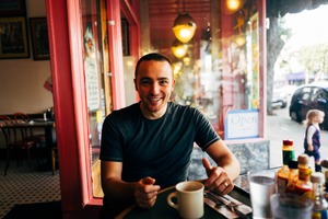 In a cozy café, a man sits at a table, smiling warmly as he gestures with a cup in hand. The soft, warm lighting captures the inviting atmosphere, while the vibrant surroundings hint at a bustling day outside. The photograph exudes a cheerful mood, encapsulating a moment of contentment amidst the daily rush.