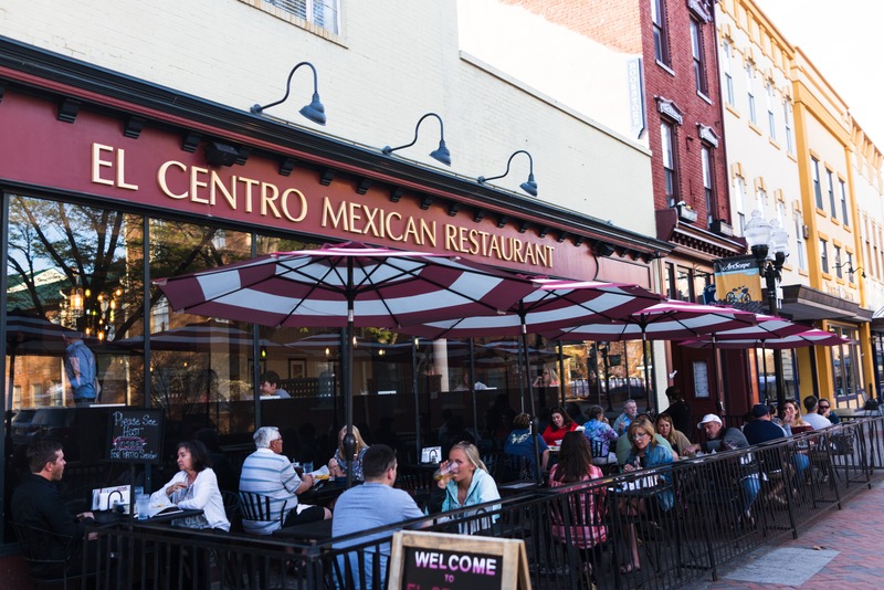 The photograph captures patrons enjoying their meals outside El Centro Mexican Restaurant, framed by colorful umbrellas and lively conversation. The warm lighting adds a welcoming ambiance to the bustling scene, hinting at a delightful culinary experience. Surrounding brick buildings complement the restaurant's inviting atmosphere, creating a charming urban setting.