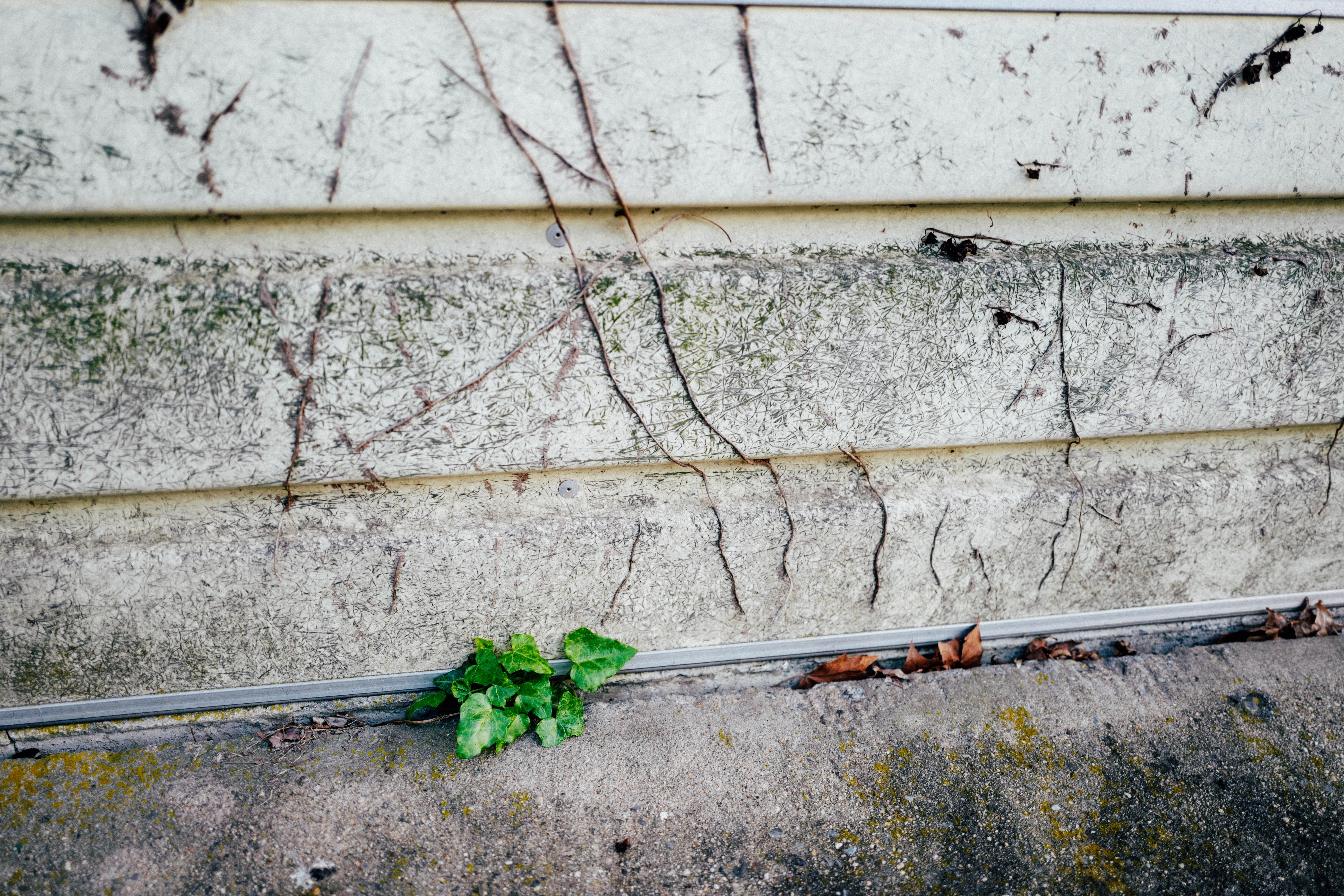 This photograph captures a solitary patch of vibrant green ivy clinging to the ground against a backdrop of weathered, peeling wall texture. The muted tones and creeping vines evoke a sense of forgotten spaces, while the delicate sunlight highlights the contrast between life and decay. The composition draws the eye to the resilience of nature amidst human neglect, creating a poignant mood of quiet tenacity.