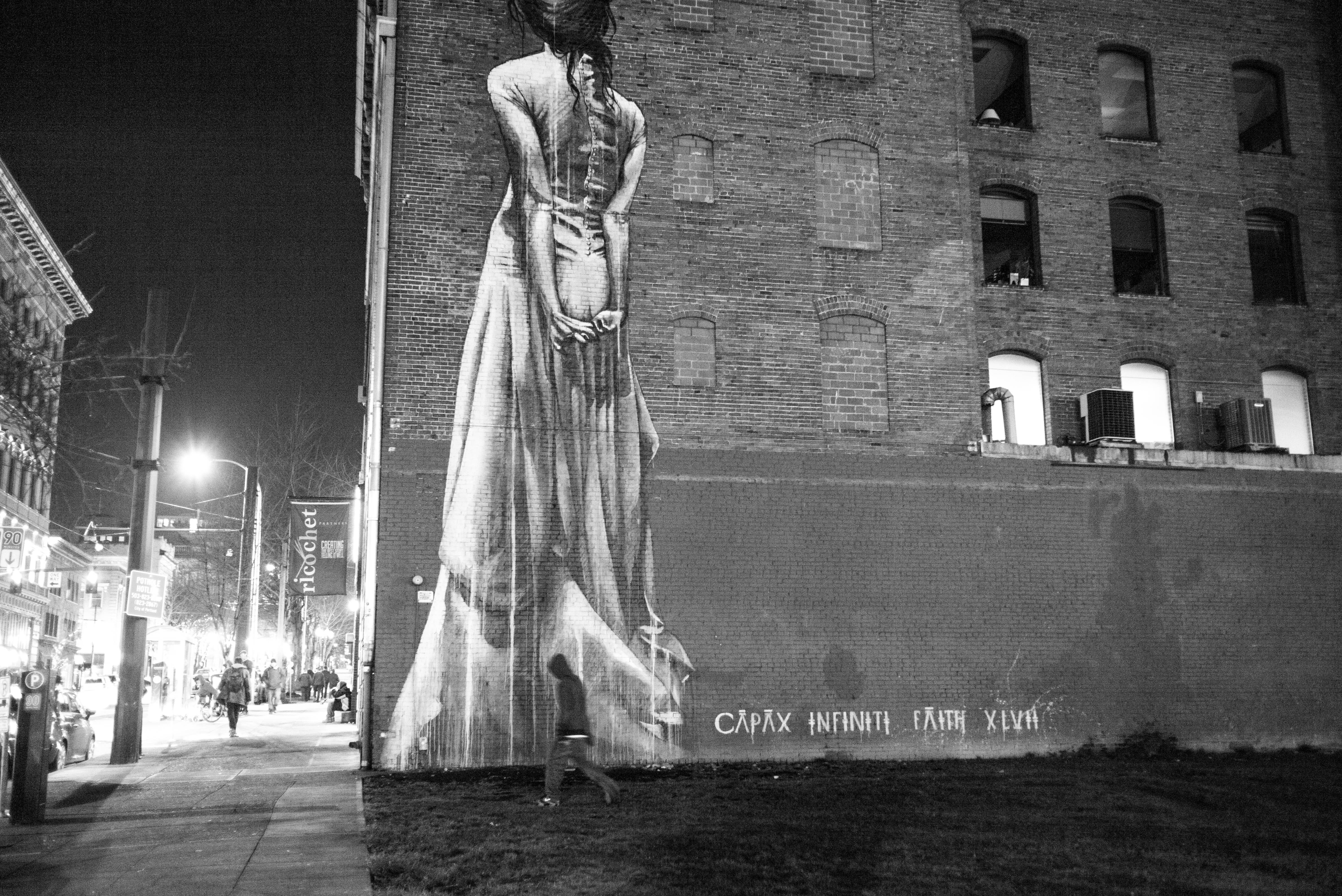 A striking mural of a woman in a flowing dress dominates a brick wall, rendered in monochrome hues that evoke a sense of melancholy. The night setting casts soft light on the scene, highlighting the delicate details of the mural while shadows deepen the surrounding urban landscape. A solitary figure walks by, emphasizing the juxtaposition of art and life in a bustling city.
