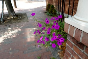 A lively cluster of purple petunias bursts forth from a decorative pot, contrasting beautifully against the brickwork beside them. The soft afternoon light gently illuminates the flowers, casting subtle shadows on the pathway, evoking a serene and welcoming atmosphere. In the background, hints of greenery and an inviting sidewalk hint at the charm of the neighborhood.