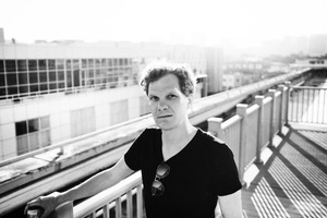 In this striking black-and-white photograph, a man stands pensively on a rooftop, bathed in bright sunlight that casts long, dramatic shadows. The composition highlights his contemplative expression against a backdrop of urban architecture, creating a mood of introspection and solitude. The high contrast of light and shadow enhances the scene’s emotional depth, evoking a sense of quiet reflection in a bustling environment.