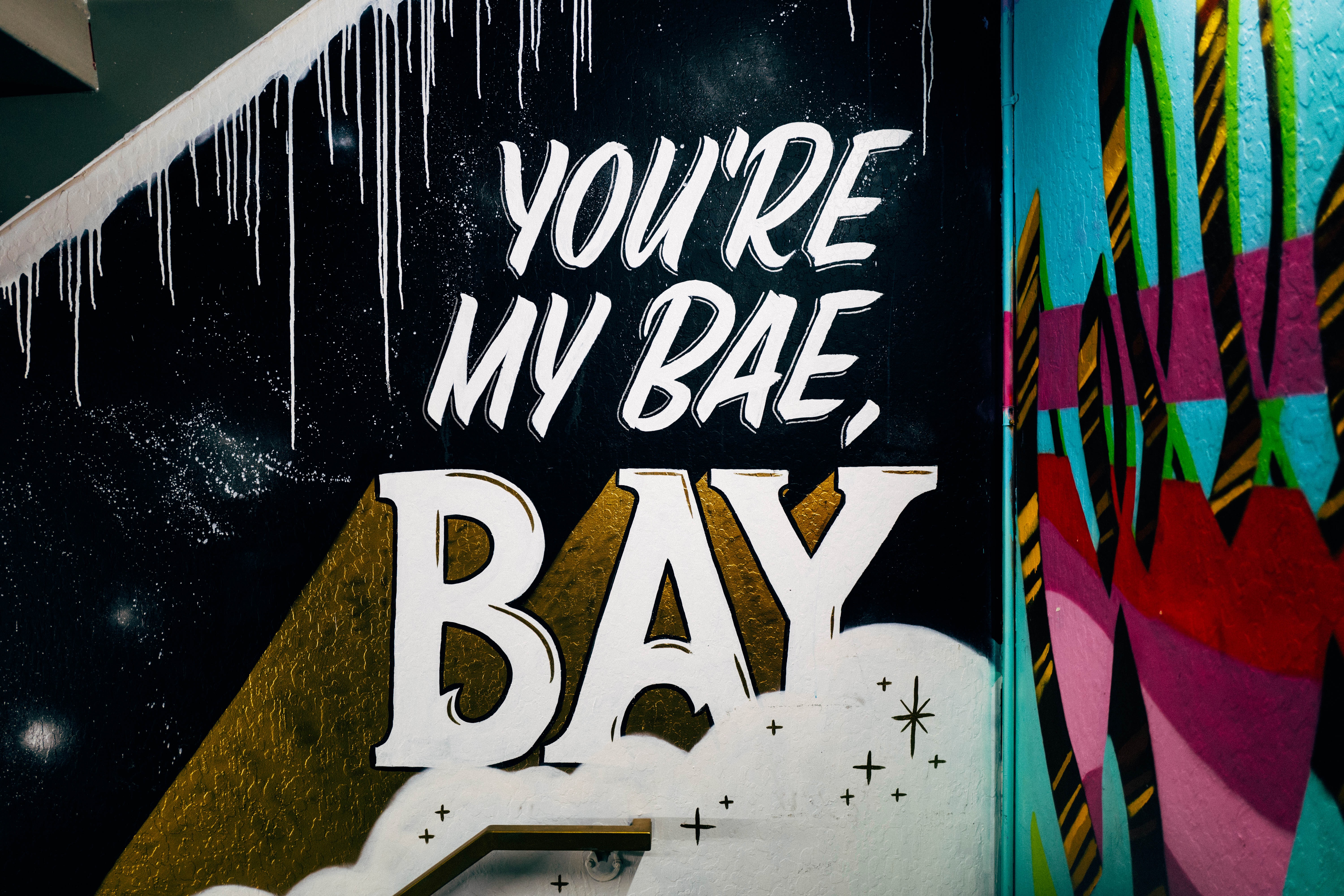 This vibrant photograph captures an exuberant mural featuring the playful phrase 'YOU'RE MY BAE, BAY' against a backdrop of bold colors. The energetic composition, with its contrasting hues and dripping paint effects, evokes a sense of youthful romance and urban creativity. The lighting highlights the textures of the wall, enhancing the mural's lively and engaging mood.
