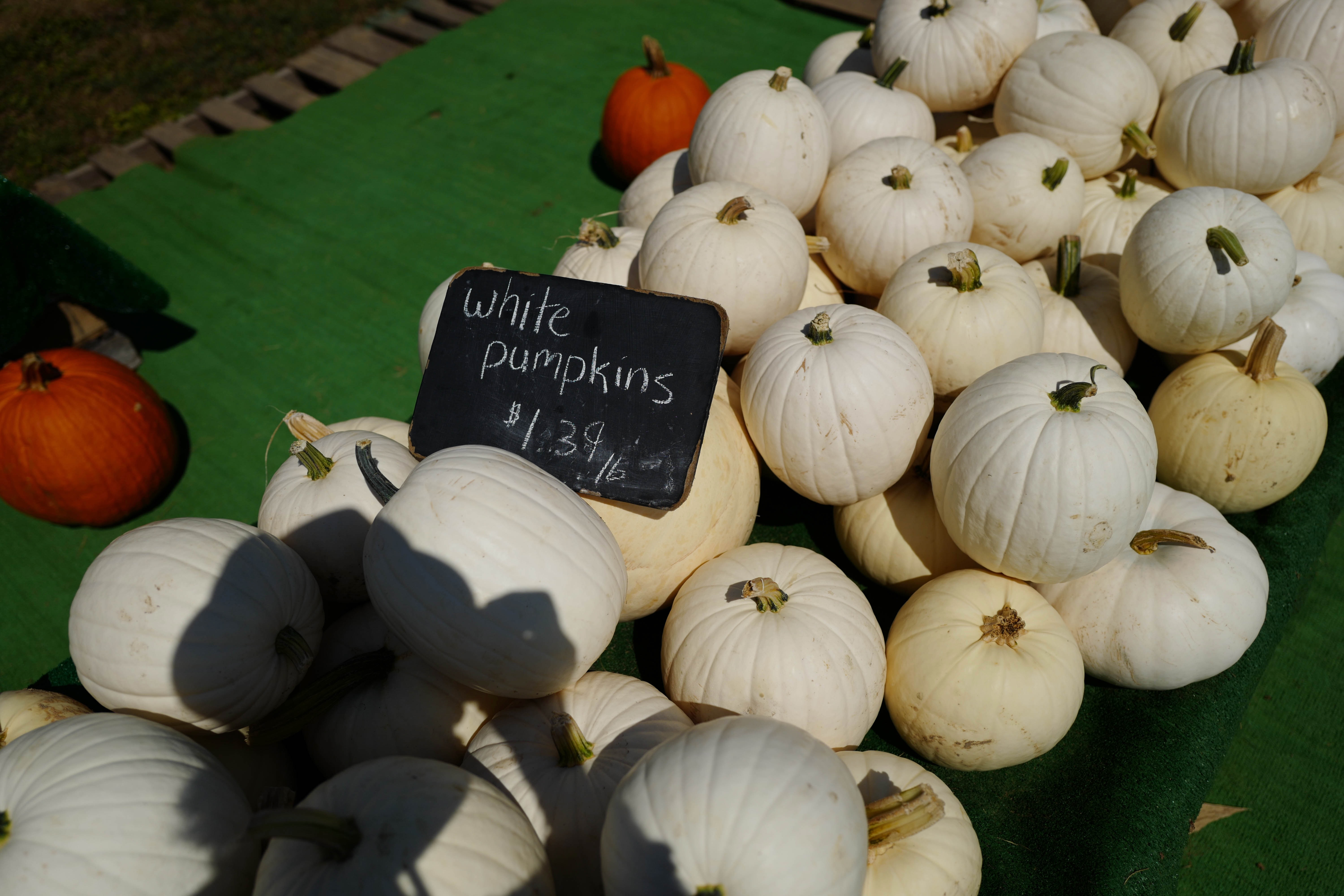 A vibrant display of white pumpkins lies abundantly on a green tablecloth, each showcasing its smooth, pale surface under golden sunlight. A small chalkboard sign indicates their price, drawing attention amidst the soft shadows cast by the pumpkins. In the background, a solitary orange pumpkin adds a splash of contrast, enhancing the seasonal charm of this harvest scene.
