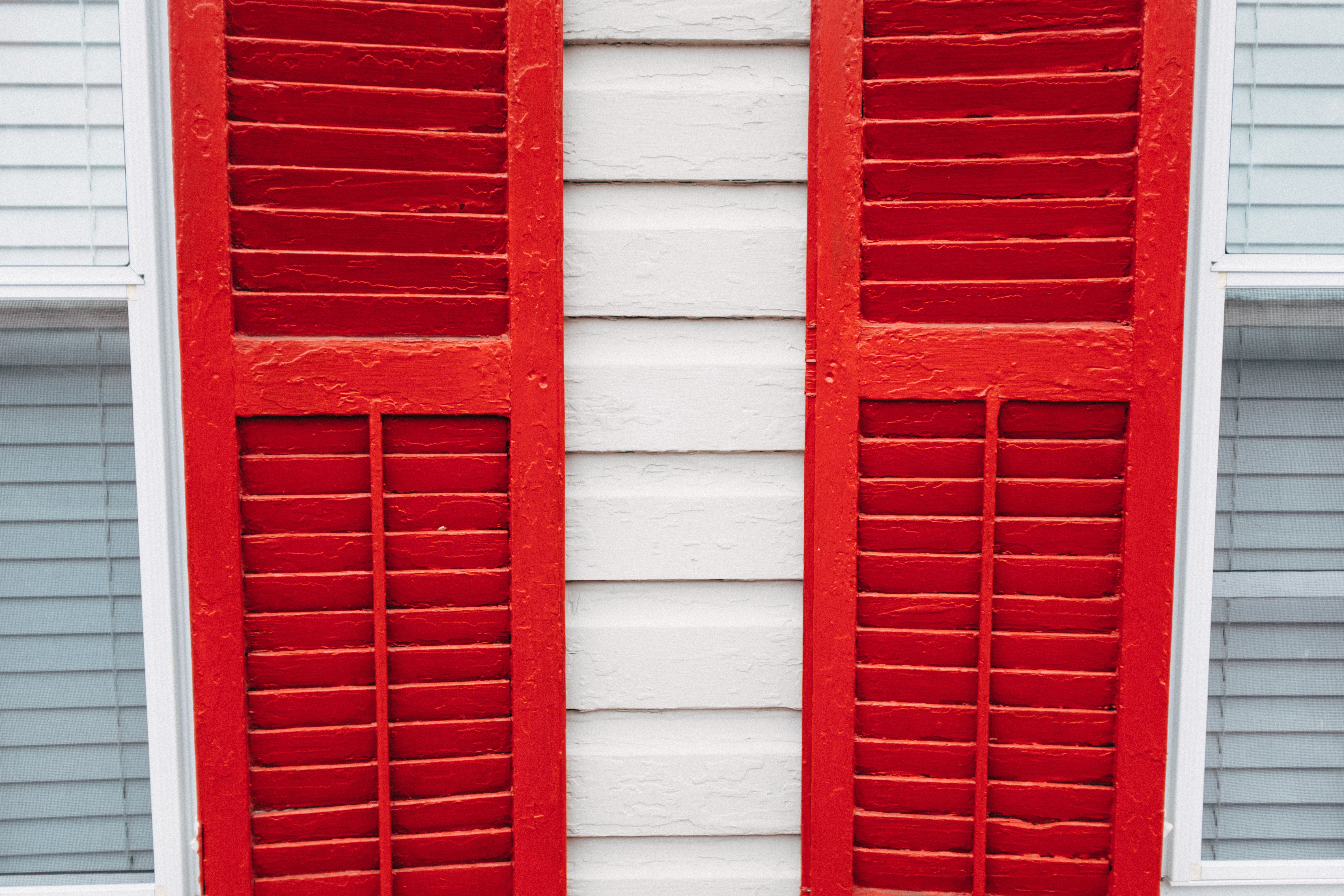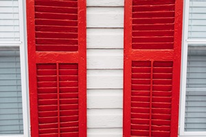 The photograph captures a striking arrangement of red shutters against a backdrop of white siding, creating a bold and eye-catching composition. The symmetrical design evokes a sense of order and charm, while the muted lighting adds a tranquil feel to the scene, inviting closer inspection of the texture and color contrast. This pleasing interplay of hues highlights the beauty found in everyday architectural details.