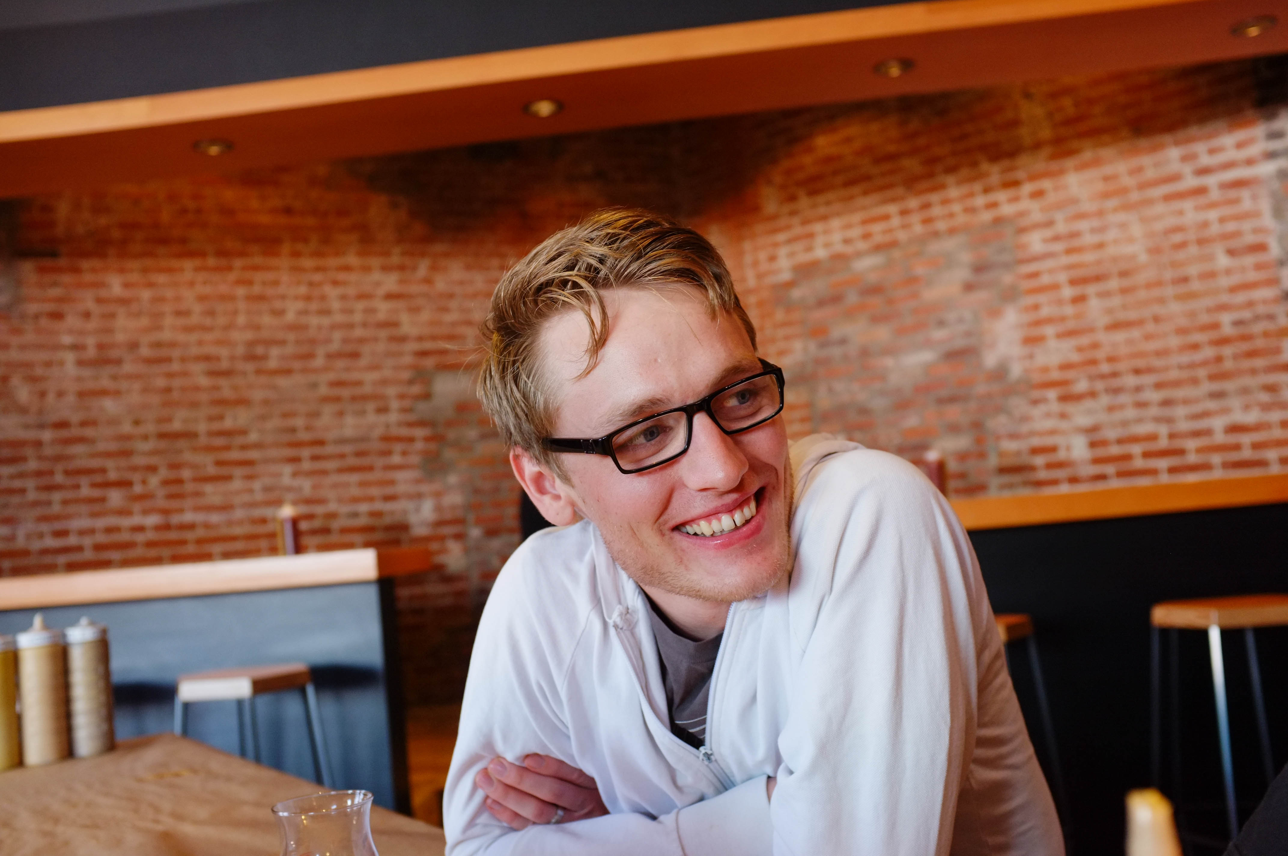 In a cozy, rustic café setting, a young man with glasses beams with a genuine smile as he leans slightly forward. The warm, diffused lighting accentuates the inviting atmosphere, highlighting the rich textures of the exposed brick wall and wooden surfaces behind him, creating an intimate and cheerful mood.