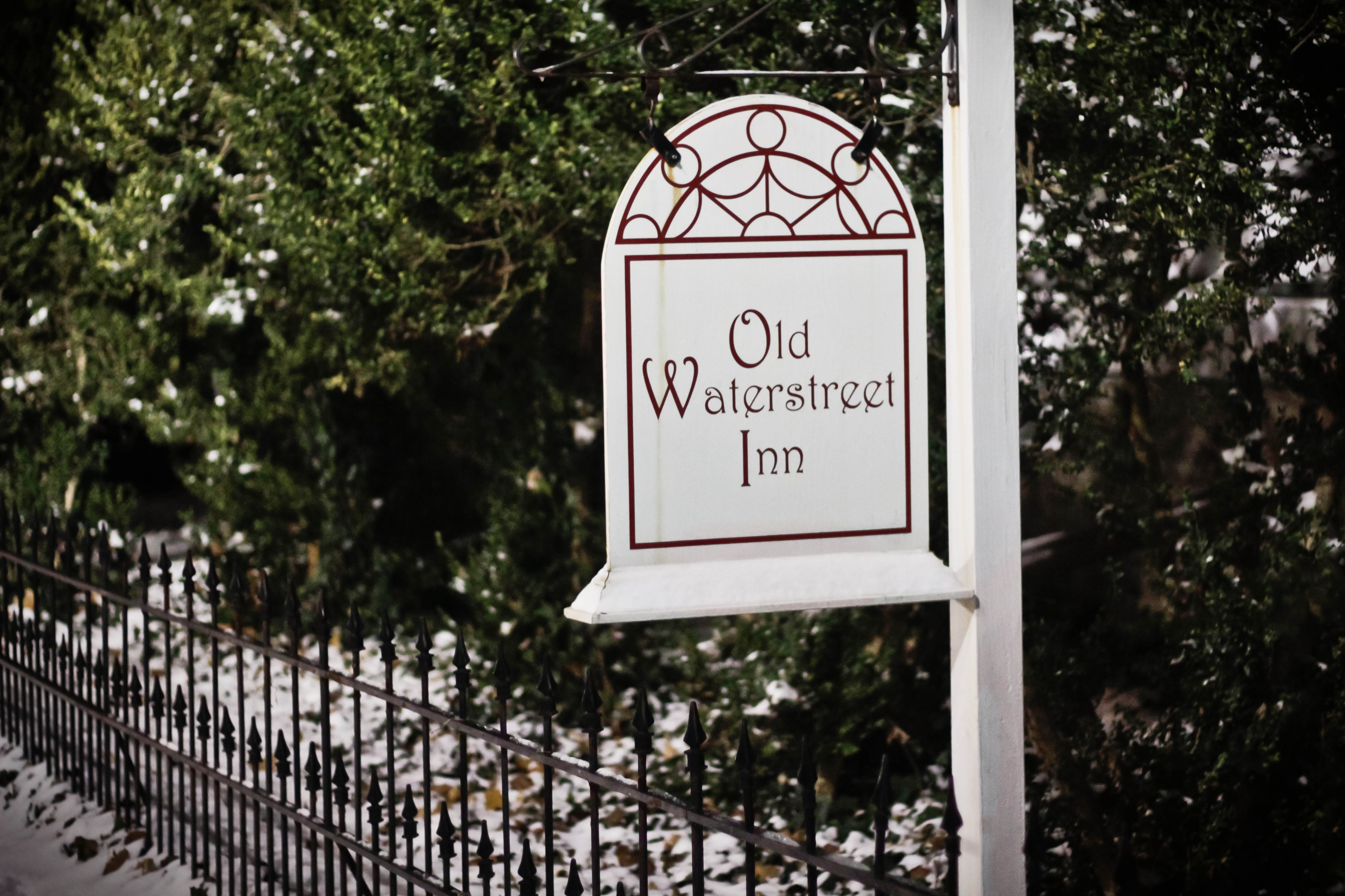 The photograph captures a quaint sign for the Old Waterstreet Inn, elegantly framed by lush greenery. Soft, muted colors and gentle lighting evoke a serene, inviting atmosphere, emphasizing the rustic charm of the inn. Touches of snow add a seasonal layer, enhancing the cozy and welcoming vibe of the setting.