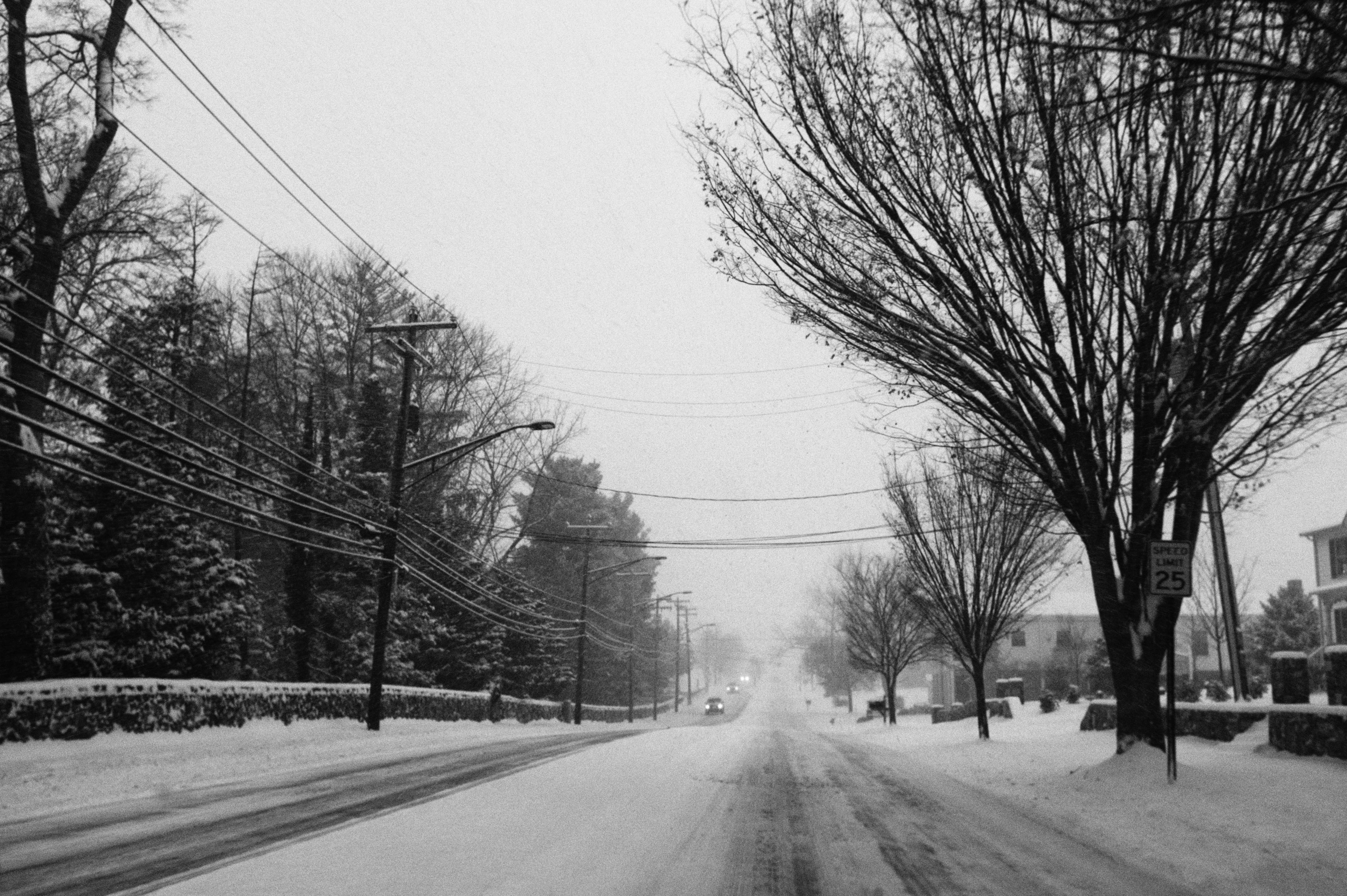 This stark black-and-white photograph captures a snow-covered street enveloped in a soft, wintry haze. The layering of trees with bare branches against the muted background creates a sense of isolation, with the faint outline of distant houses emerging through the snowfall. The composition evokes a quiet, contemplative mood, as the gentle falling snow blurs the boundaries between road and landscape.