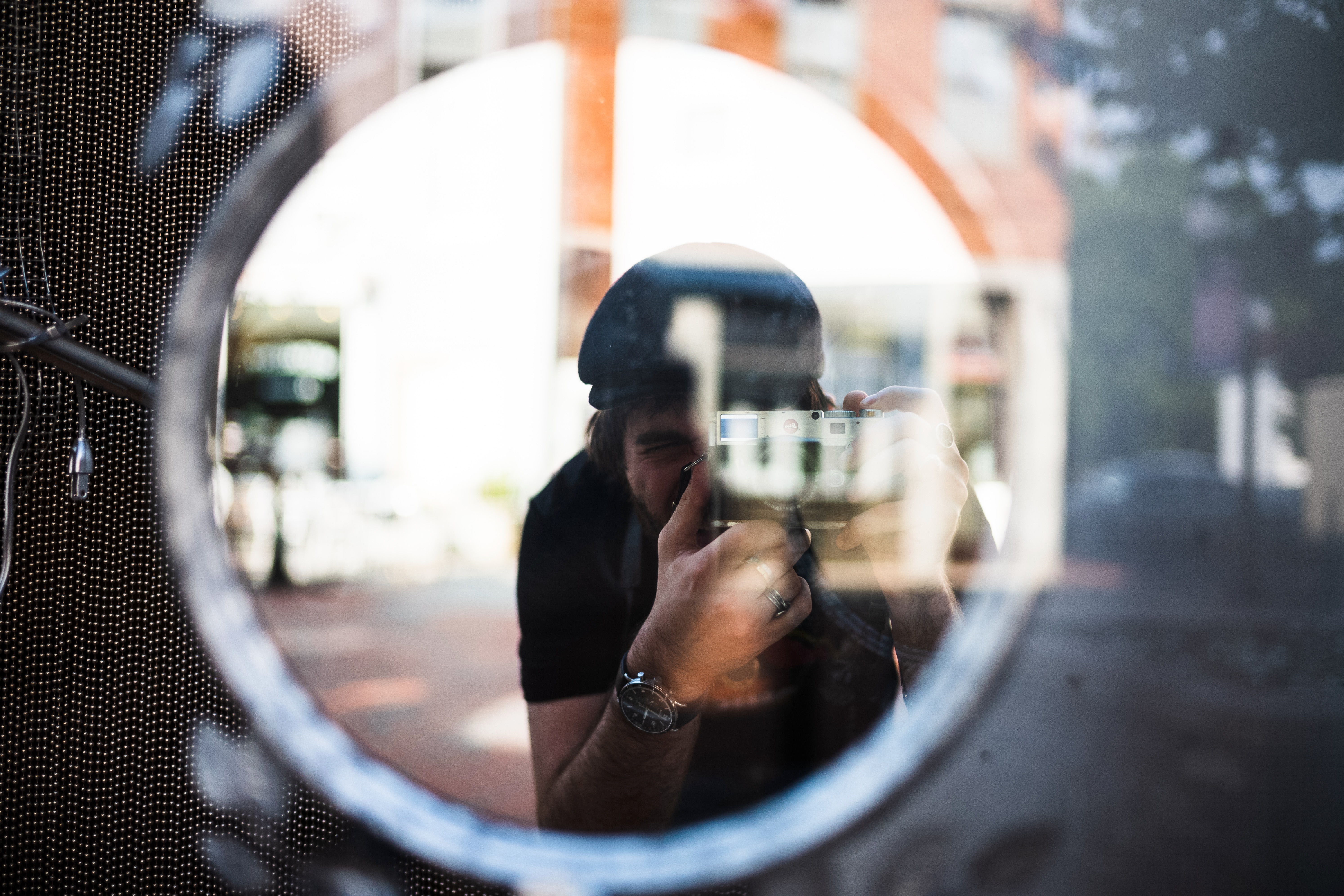 The photograph captures a playful moment of a photographer framed within a circular reflection on a glass surface, drawing the viewer's eye into the focus of his camera. The warm, natural lighting enhances the urban backdrop, creating a sense of curiosity and introspection. The composition juxtaposes the artist's casual demeanor against the bustling environment outside, encapsulating the art of observation.