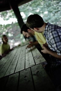 The photograph captures a group of friends deeply engaged in a game at a rustic wooden table, bathed in soft, dappled sunlight filtering through nearby trees. The blurred background accentuates the focus on their concentrated expressions and the subtle gesture of hands moving playing pieces, creating a mood of camaraderie and playful tension. The warm tones and natural setting evoke a sense of nostalgia and togetherness, inviting viewers into this intimate moment.