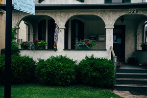 This photograph captures a quaint, welcoming home with arches framing the porch, adorned with vibrant flowers that add a touch of warmth. The muted colors of the building contrast with the rich green foliage, evoking a serene, inviting atmosphere. Soft natural light enhances the details, emphasizing the home's character and charm.