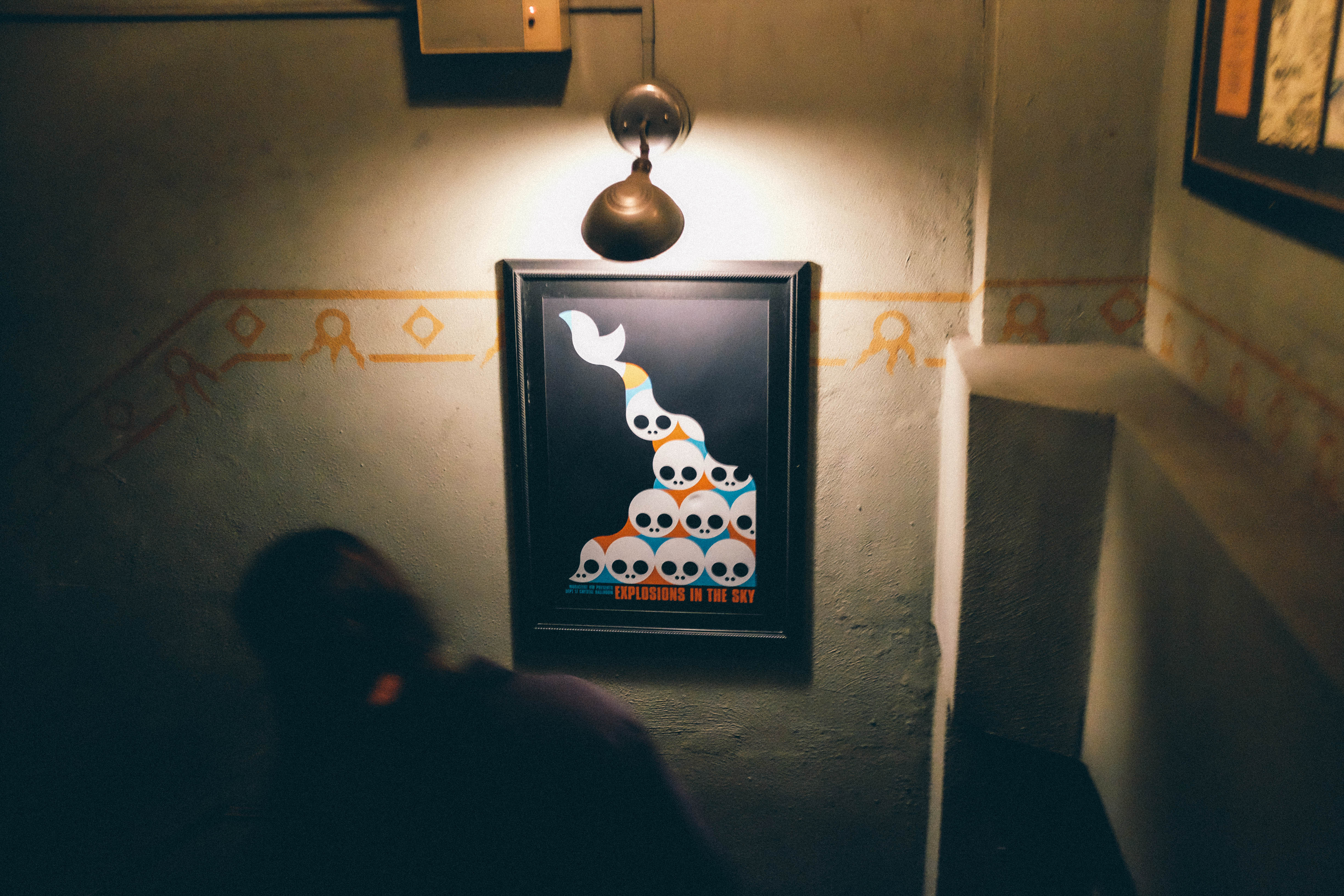 The photograph captures a dimly lit stairway featuring an art piece titled 'Explosions in the Sky' illuminated by a warm overhead light. The muted colors of the wall contrast with the vibrant artwork, creating an intimate yet haunting atmosphere. A blurred figure suggests movement, enhancing the sense of mystery in the space.