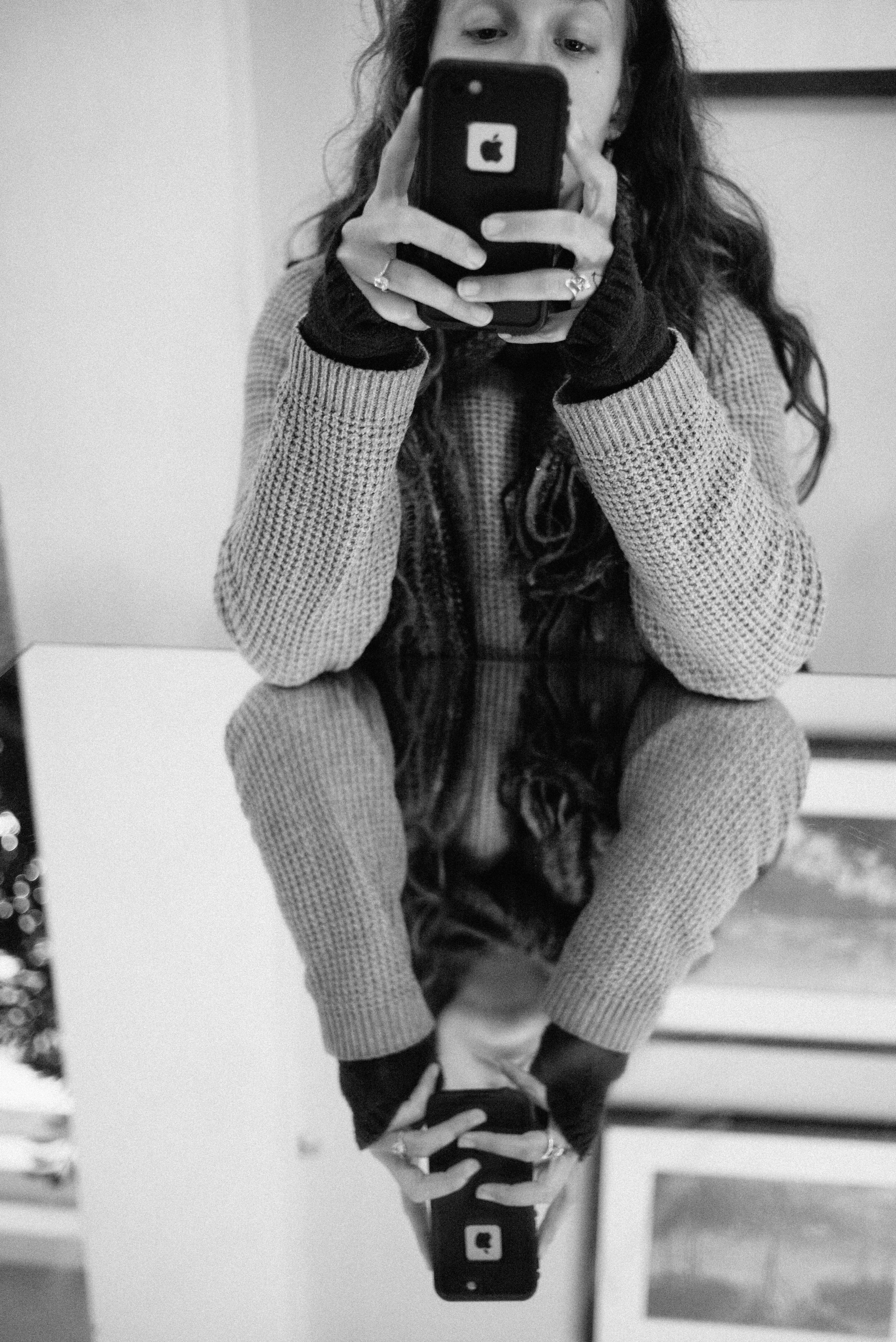 This intriguing photograph captures a young woman absorbed in her smartphone, her figure mirrored in a shiny surface below. The soft lighting and monochrome palette convey a sense of introspection and modern isolation, while the casual attire adds to the cozy, relaxed atmosphere. The composition draws the viewer's eye towards the duality of reflection, emphasizing the theme of connection in a digital age.