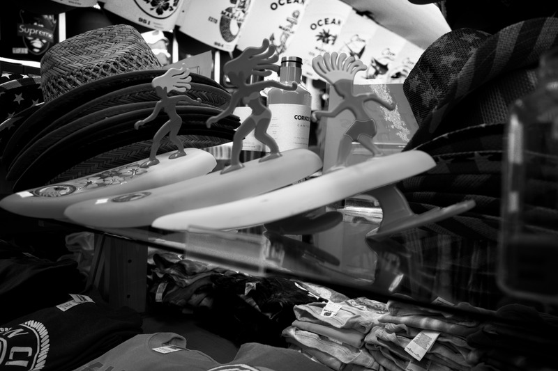 In this black and white photograph, playful silhouettes of surfers are juxtaposed against a backdrop of vibrant merchandise in a beach shop. The composition layers hats and surfboards, creating a lively sense of nostalgia and summer fun. The lighting adds depth, casting soft shadows that enhance the laid-back, carefree vibe of the scene.