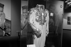 The photograph captures a dazzling, intricately embellished costume displayed in a glass case, showcasing its shimmering details against a muted backdrop. The monochromatic tones heighten the drama, evoking nostalgia and reverence for the performer it once adorned. Soft lighting accentuates the curves and textures, inviting the viewer to reflect on the legacy of the artistry it represents.