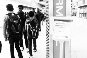 The photograph captures a group of young individuals engaged in conversation while waiting near a security checkpoint, embodying a casual, everyday moment. The black-and-white composition enhances the sense of nostalgia and reflection, focusing on their youthful expressions and interactions. Soft, ambient lighting adds a subtle warmth to the bustling airport atmosphere, juxtaposed with the sterile, modern lines of the security apparatus.