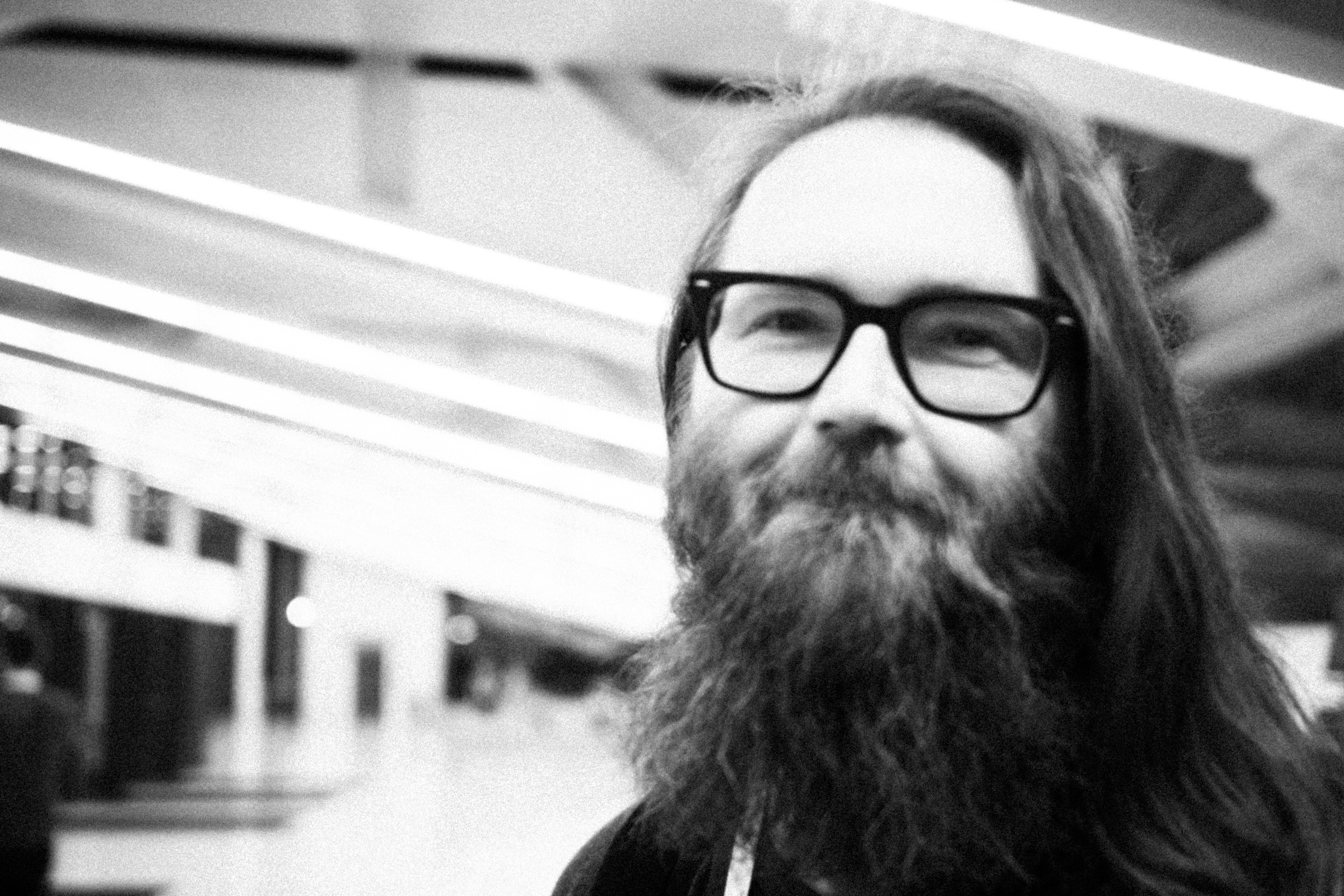 A close-up portrait of an individual with long hair and a thick beard, captured in soft black and white. The background features blurred lines of fluorescent lighting, creating a dynamic contrast with the subject's serene smile, evoking a sense of calm amidst an urban environment. The composition draws the viewer's eye directly to the expressive face, enhancing the mood of warmth and connection.