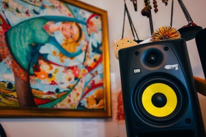 This photograph captures a playful juxtaposition between a sleek black speaker and a colorful, whimsical painting in the background. The soft lighting enhances the vibrancy of the artwork, while the speaker's bold design draws the eye, suggesting a lively atmosphere filled with music and creativity. The composition invites viewers to appreciate both the art and the technology that complements it, reflecting a dynamic interaction between sound and visual expression.