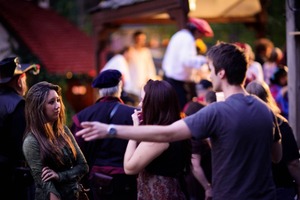 The photograph captures a bustling festival scene with individuals engaged in conversation amidst a backdrop of lively performers. The soft, diffused lighting creates a warm, intimate atmosphere, contrasting with the vibrant hues of costumes and the blurred motion of the crowd, encapsulating a moment of connection and intrigue. The expressions of the subjects hint at a narrative of interaction, curiosity, and perhaps, contemplation.