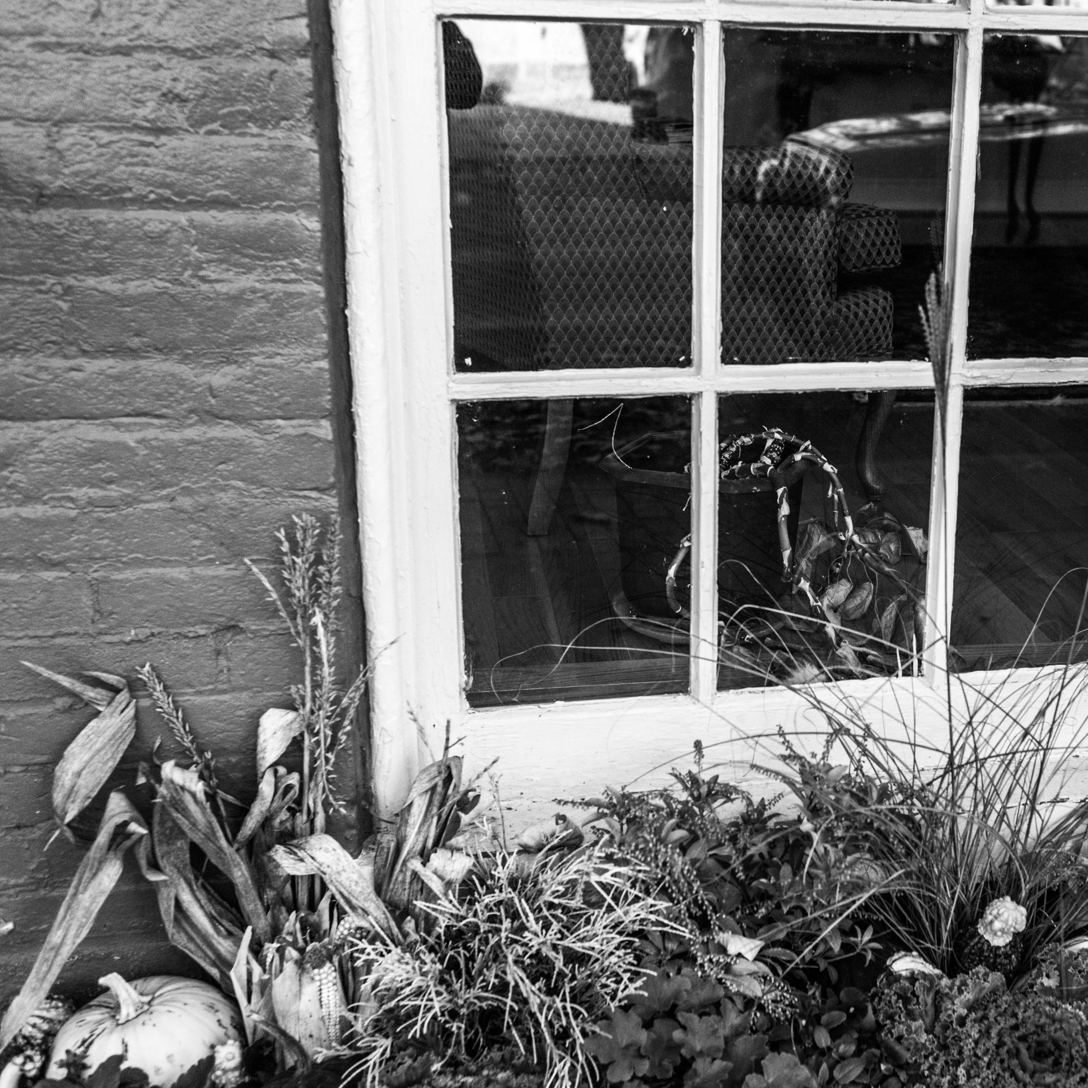 This black-and-white photograph captures the serene intimacy of a window framed by overgrown plants, hinting at a cozy interior. The muted tones and soft reflections create a nostalgic atmosphere, evoking a sense of longing for connection and warmth. The juxtaposition of the lush foliage against the structured glass adds depth, inviting the viewer to pause and reflect on the life both inside and outside.