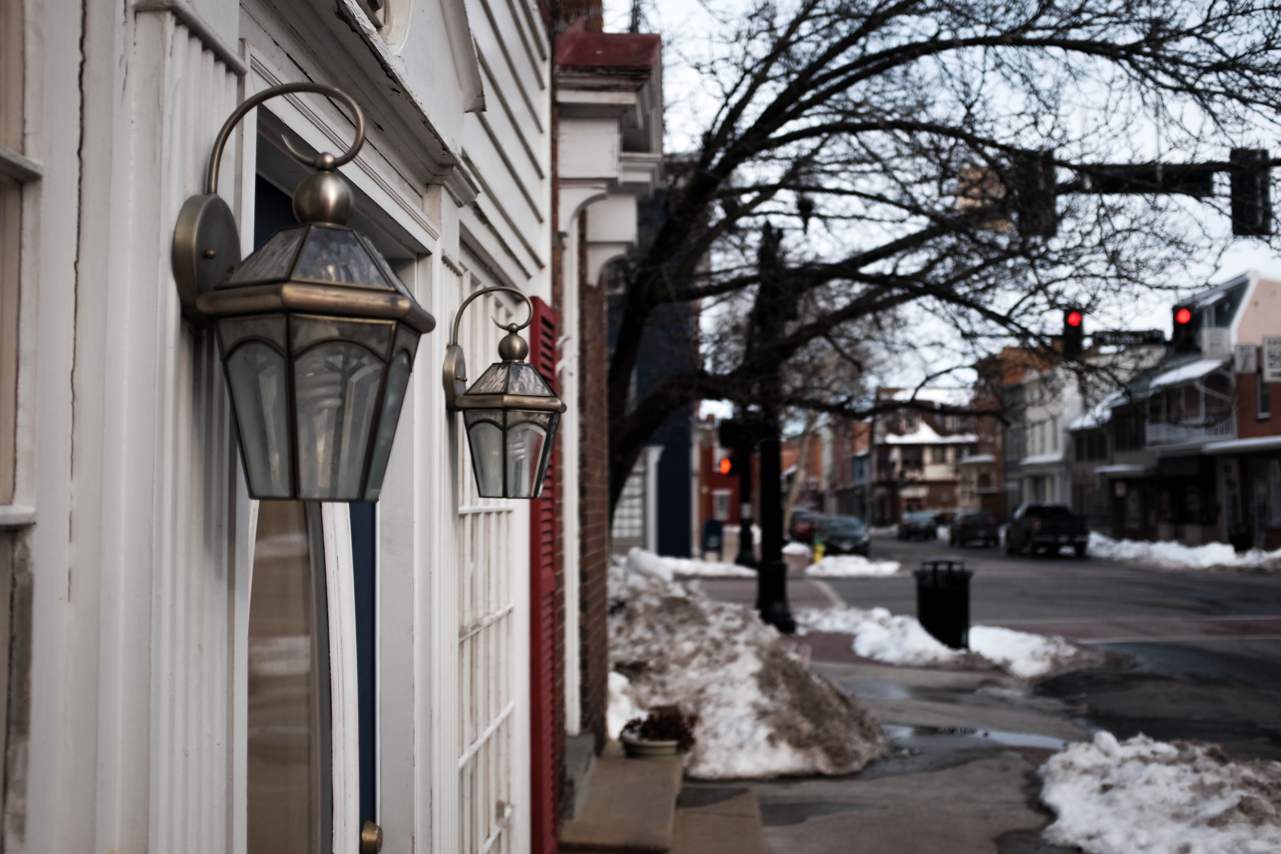 The photograph captures a quiet winter street, framed by vintage lanterns that evoke a sense of nostalgia. The muted colors and soft lighting create a tranquil, reflective mood, while the snowy remnants reveal the lingering chill of the season. A sparse streetscape in the background adds depth, contrasting the warmth of the lanterns against the cold ambiance outside.